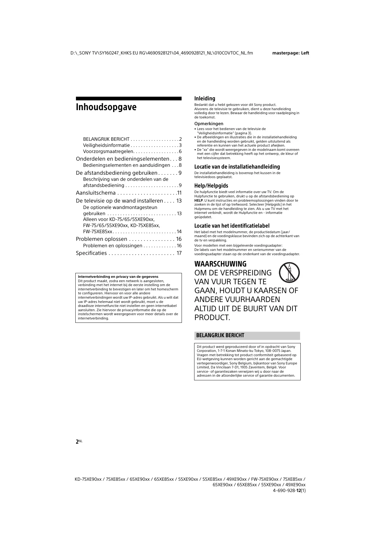 PRODUCT. BELANGRIJK BERICHT Dit product werd geproduceerd door of in opdracht van Sony Corporation, 1-7-1 Konan Minato-ku Tokyo, 108-0075 Japan. Vragen met betrekking tot product conformiteit gebaseerd op EU-wetgeving kunnen worden gericht aan de gemachtigde vertegenwoordiger, Sony Belgium, bijkantoor van Sony Europe Limited, Da Vincilaan 7-D1, 1935 Zaventem, België. Voor service- of garantiezaken verwijzen wij u door naar de adressen in de afzonderlijke service of garantie documenten. 2NL KD-75XE90xx / 75XE85xx / 65XE90xx / 65XE85xx / 55XE90xx / 55XE85xx / 49XE90xx / FW-75XE90xx / 75XE85xx / 65XE90xx / 65XE85xx / 55XE90xx / 49XE90xx 4-690-928-12(1) D:\_SONY TV\SY160247_KHKS EU RG\4690928121\04_4690928121_NL\010COVTOC_NL.fm Opmerking voor radioapparatuur Sony Corporation verklaart hierbij dat de radioapparatuur type KD-75XE9005, KD-75XE8596, KD-65XE9005, KD-65XE8599, KD-65XE8596, KD-65XE8588, KD-65XE8577, KD-65XE8505, KD-55XE9005, KD-55XE8599, KD-55XE8596, KD-55XE8588, KD-55XE8577, KD-55XE8505, KD-49XE9005, FW-75XE9001, FW-75XE8501, FW-65XE9001, FW-65XE8501, FW-55XE9001, FW-49XE9001 voldoen aan de essentiële voorschriften en andere relevante bepalingen van Richtlijn 1999/5/EG. Nadere informatie kunt u vinden op: http://www.compliance.sony.de/ masterpage: Right