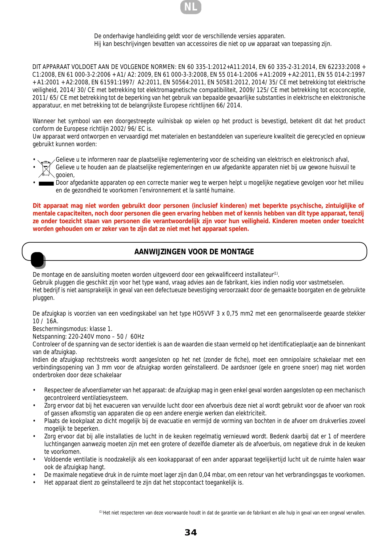 EN 60 335-1:2012+A11:2014, EN 60 335-2-31:2014, EN 62233:2008 + C1:2008, EN 61 000-3-2:2006 + A1/A2: 2009, EN 61 000-3-3:2008, EN 55 014-1:2006 + A1:2009 + A2:2011, EN 55 014-2:1997 + A1:2001 + A2:2008, EN 61591:1997/ A2:2011, EN 50564:2011, EN 50581:2012, 2014/35/CE relative à la sécurité électrique, 2014/30/CE relative à la compatibilité électromagnétique, 2009/125/CE relative à l’écoconception, 2011/65/CE relative à la limitation de l’utilisation de certaines substances dangereuses dans les équipements électriques et électroniques, et aux principales exigences des directives européennes 66/2014. Lorsque le symbole d’une poubelle à roue barrée est attaché à un produit, cela signifie que le produit est couvert par la directive Européenne 2002/96/EC. Votre produit est conçu et fabriqué avec des matériaux et des composants de haute qualité qui peuvent être recyclés et utilisés de nouveau : • • Cet appareil ne doit pas être utilisé par des personnes (y compris les enfants) ayant des capacités psychiques, sensorielles ou mentales réduites, ni par des personnes n’ayant pas l’expérience et la connaissance de ce type d’appareils, à moins d’être sous le contrôle et la formation de personnes responsables de leur sécurité. Les enfants doivent être surveillés pour s’assurer qu’ils ne jouent pas avec l’appareil.