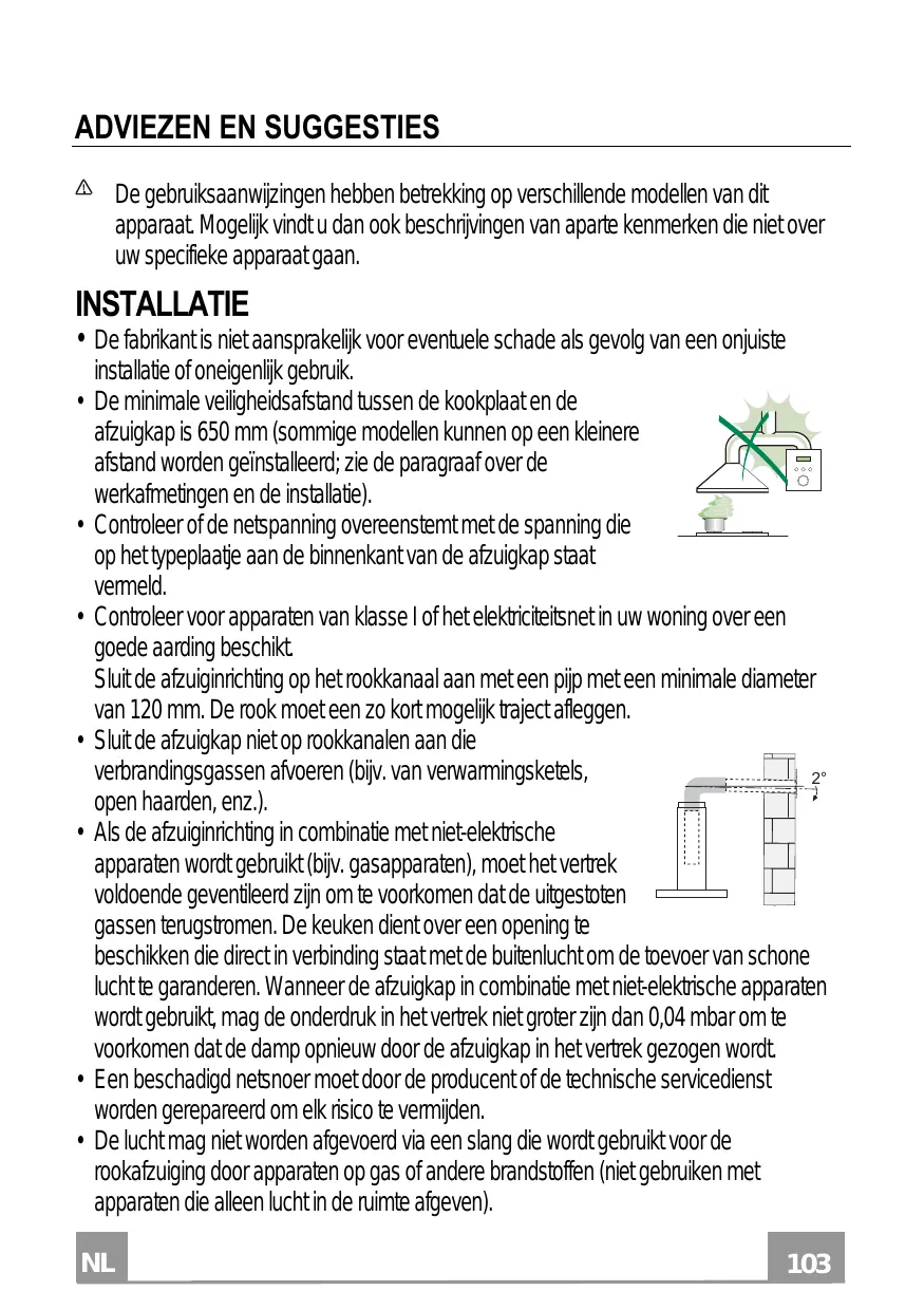 - Controleer voor apparaten van klasse I of het elektriciteitsnet in uw woning over een goede aarding beschikt. Sluit de afzuiginrichting op het rookkanaal aan met een pijp met een minimale diameter van 120 mm. De rook moet een zo kort mogelijk traject afleggen.