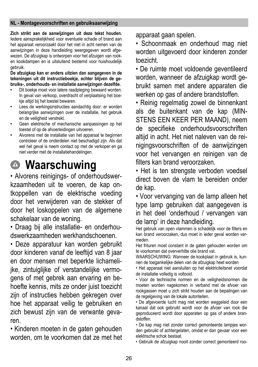 NL - Montagevoorschriften en gebruiksaanwijzing Zich strikt aan de aanwijzingen uit deze tekst houden. Iedere aansprakelijkheid voor eventuele schade of brand aan het apparaat veroorzaakt door het niet in acht nemen van de aanwijzingen in deze handleiding weergegeven wordt afgewezen. De afzuigkap is ontworpen voor het afzuigen van rooken kookdampen en is uitsluitend bestemd voor huishoudelijk gebruik. De afzuigkap kan er anders uitzien dan aangegeven in de tekeningen uit dit instructieboekje, echter blijven de gebruiks-, onderhouds- en installatie aanwijzingen dezelfde.
