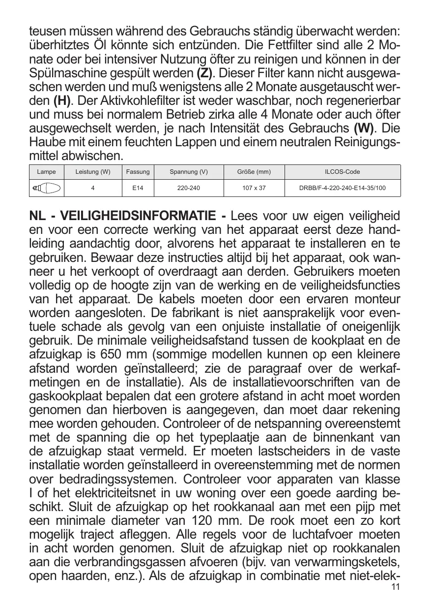 éliminé correctement, vous participez à prévenir des conséquences potentiellement négatives pour l’environnement et pour la santé, qui risqueraient de se présenter en cas d'élimination inappropriée. Pour toute information supplémentaire sur le recyclage de ce pro- duit, contactez votre municipalité, votre déchetterie locale ou le magasin où vous avez acheté ce produit. Cette hotte aspirante a été conçue exclusivement pour un usage domestique, dans le but d'éliminer les odeurs de cuisine. Ne jamais utiliser la hotte pour des objectifs différents de ceux pour lesquels elle a été conçue. Ne jamais laisser un feu vif allumé sous la hotte lorsque celle-ci est en fonction. Régler l'intensité du feu de manière à l’orienter exclusivemetnt vers le fond de la casserole, en vous assurant qu'il ne déborde pas sur les côtés. Contrôler constamment les friteuses durant leur utilisation : l'huile surchauffée risque de s’incendier. Nettoyer les filtres à graisse tous les 2 mois de fonctionnement ou plus souvent en cas d'utilisation particulièrement intense. Ces filtres peuvent être lavés au lave-vaisselle (Z). Ce filtre ne peut être lavé; il est indispensable de le changer tous les deux mois (H). Le filtre à charbon actif ne peut être ni lavé ni régénéré et il doit être remplacé environ tous les 4 mois de fonctionnement ou plus souvent en cas d'utilisation particulièrement intense (W). Nettoyer la hotte avec un chiffon humide et un détergent liquide neutre.