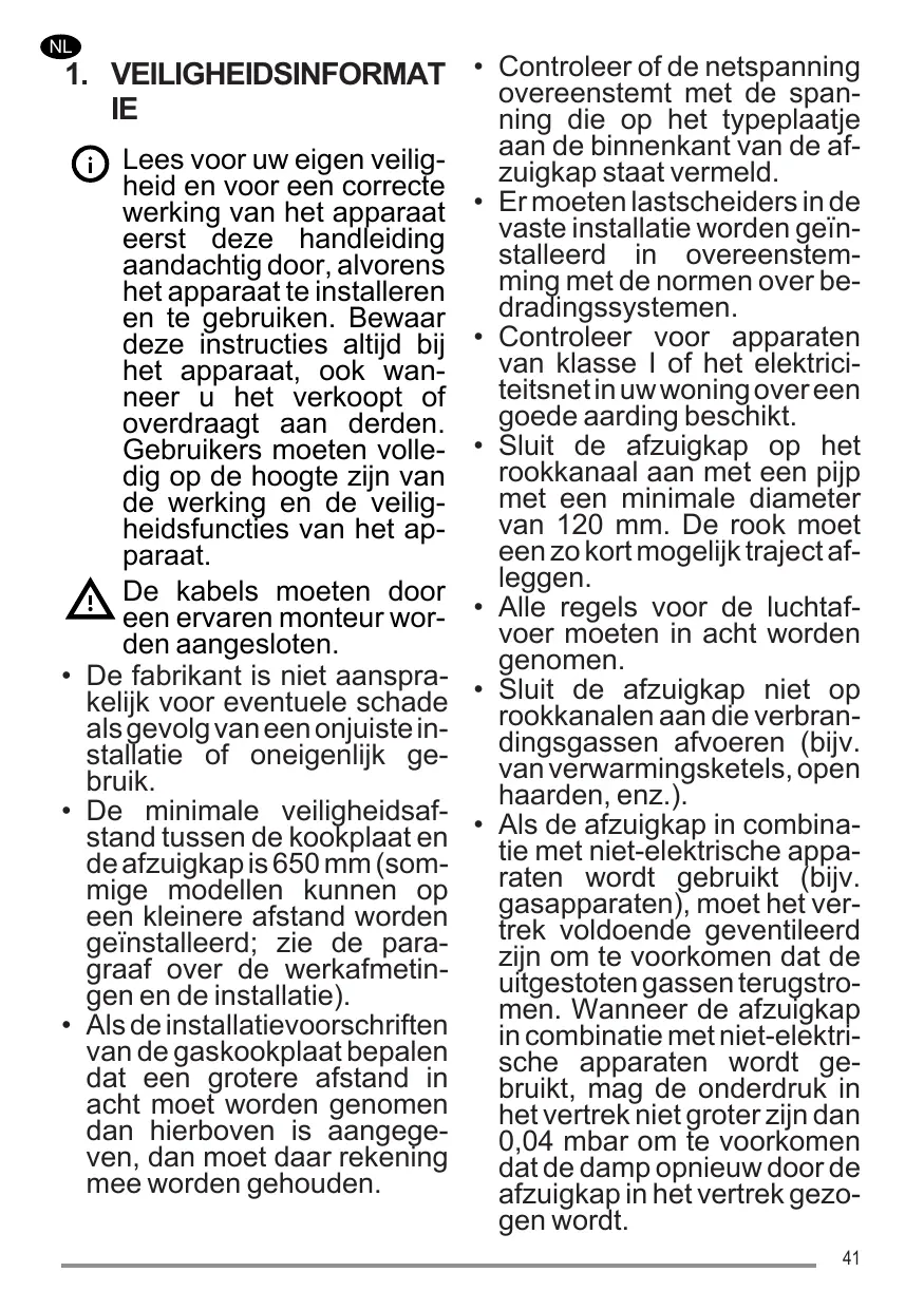 1. SICHERHEITSINFORMA TIONEN Lesen Sie bitte für Ihre eigene Sicherheit und die korrekte Funktion des Geräts diese Betriebsanleitung sorgfältig durch, bevor Sie es installieren und in Betrieb nehmen. Bewahren Sie die Betriebsanleitung stets zusammen mit dem Gerät auf, auch falls Sie dieses verkaufen oder Dritten überlassen. Es ist wichtig, dass die Benutzer mit allen Funktionsund Sicherheitsmerkmalen des Gerätes vertraut sind. Die Kabel müssen von kompetentem Fachpersonal angeschlossen werden. • En aucun cas le fabricant ne peut être tenu pour responsable de dommages éventuellement dus à une installation ou à une utilisation impropre. • La distance de sécurité minimum entre la table de cuisson et la hotte aspirante est de 650 mm (certains modèles peuvent être installés à une hauteur inférieure ; voir le paragraphe concernant les dimensions de travail et l’installation). • Si les instructions d’installation de la table de cuisson à gaz spécifient une distance supérieure à celle indiquée ci-