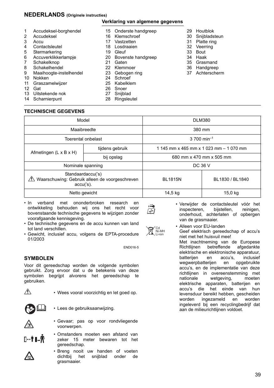 • Verwijder de contactsleutel vóór het inspecteren, bijstellen, reinigen, onderhoud, achterlaten of opbergen van de grasmaaier. • Alleen voor EU-landen Geef elektrisch gereedschap of accu’s niet met het huisvuil mee! Met inachtneming van de Europese Richtlijnen betreffende afgedankte elektrische en elektronische apparatuur, batterijen en accu’s, inclusief wegwerpbatterijen en opgebruikte accu’s, en de implementatie van deze richtlijnen in overeenstemming met nationale wetgeving, moeten elektrische apparaten, batterijen en accu’s die het einde van hun levensduur bereikt hebben, gescheiden worden ingezameld en worden ingeleverd bij een recyclingbedrijf dat aan de milieurichtlijnen voldoet.