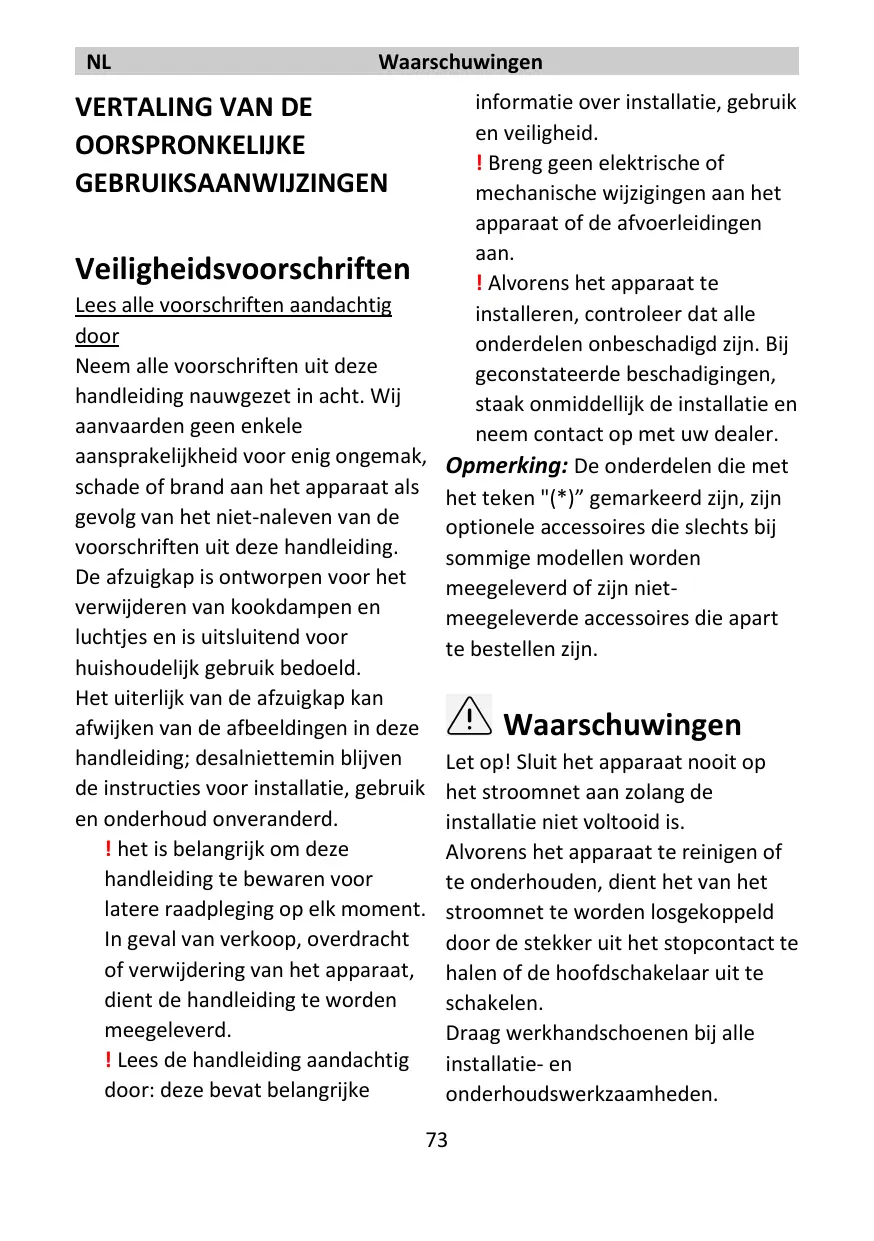 La hotte peut avoir des caractéristiques esthétiques différentes par rapport aux dessins de ce mode d’emploi. Les instructions pour l’utilisation, l'entretien et l’installation restent quoi qu’il en soit les mêmes. ! il est important de conserver ce manuel pour pouvoir le consulter à tout moment. En cas de vente, de cession ou de déménagement, s'assurer qu’il accompagne le produit. ! Lisez les instructions attentivement : il y a