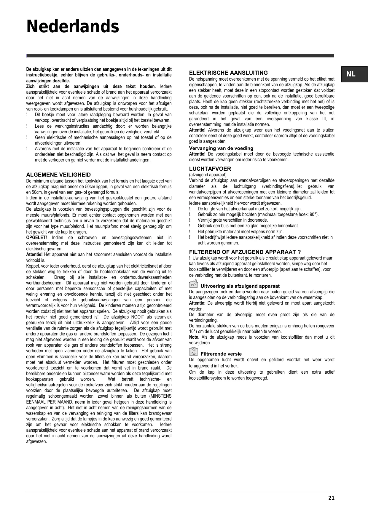 ALGEMENE VEILIGHEID De minimum afstand tussen het kookvlak van het fornuis en het laagste deel van de afzuigkap mag niet onder de 50cm liggen, in geval van een elektrisch fornuis en 50cm, in geval van een gas- of gemengd fornuis. Indien in de installatie-aanwijzing van het gaskooktoestel een grotere afstand wordt aangegeven moet hiermee rekening worden gehouden. De afzuigkap is voorzien van bevestigingspluggen die geschikt zijn voor de meeste muurs/plafonds. Er moet echter contact opgenomen worden met een gekwalificeerd technicus om u ervan te verzekeren dat de materialen geschikt zijn voor het type muur/plafond. Het muur/plafond moet stevig genoeg zijn om het gewicht van de kap te dragen. OPGELET! Indien de schroeven en bevestigingssystemen niet in overeenstemming met deze instructies gemonteerd zijn kan dit leiden tot elektrische gevaren. Attentie! Het apparaat niet aan het stroomnet aansluiten voordat de installatie voltooid is. Koppel, voor ieder onderhoud, eerst de afzuigkap van het elektriciteitsnet af door de stekker weg te trekken of door de hoofdschakelaar van de woning uit te schakelen. Draag bij alle installatie- en onderhoudswerkzaamheden werkhandschoenen. Dit apparaat mag niet worden gebruikt door kinderen of door personen met beperkte sensorische of geestelijke capaciteiten of met weinig ervaring en onvoldoende kennis, tenzij dit niet geschiedt onder het toezicht of volgens de gebruiksaanwijzingen van een persoon die verantwoordelijk is voor hun veiligheid. De kinderen moeten altijd gecontroleerd worden zodat zij niet met het apparaat spelen. De afzuigkap nooit gebruiken als het rooster niet goed gemonteerd is! De afzuigkap NOOIT als steunvlak gebruiken tenzij dit niet uitdrukkelijk is aangegeven. Altijd voor een goede ventilatie van de ruimte zorgen als de afzuigkap tegelijkertijd wordt gebruikt met andere apparaten die gas en andere brandstoffen toepassen. De gezogen lucht mag niet afgevoerd worden in een leiding die gebruikt wordt voor de afvoer van rook van apparaten die gas of andere brandstoffen toepassen. Het is streng verboden met open vlammen onder de afzuigkap te koken. Het gebruik van open vlammen is schadelijk voor de filters en kan brand veroorzaken, daarom moet het absoluut vermeden worden. Het frituren moet geschieden onder voortdurend toezicht om te voorkomen dat verhit vet in brand raakt. De bereikbare onderdelen kunnen bijzonder warm worden als deze tegelijkertijd met kookapparaten gebruikt worden. Wat betreft technische- en veiligheidsmaatregelen voor de rookafvoer zich strikt houden aan de regelingen voorzien door de plaatselijke bevoegde autoriteiten. De afzuigkap moet regelmatig schoongemaakt worden, zowel binnen als buiten (MINSTENS EENMAAL PER MAAND, neem in ieder geval hetgeen in deze handleiding is aangegeven in acht). Het niet in acht nemen van de reinigingsnormen van de wasemkap en van de vervanging en reiniging van de filters kan brandgevaar veroorzaken. Zorg altijd dat de lampjes in de kap aanwezig en goed gemonteerd zijn om het gevaar voor elektrische schokken te voorkomen. Iedere aansprakelijkheid voor eventuele schade aan het apparaat of brand veroorzaakt door het niet in acht nemen van de aanwijzingen uit deze handleiding wordt afgewezen.