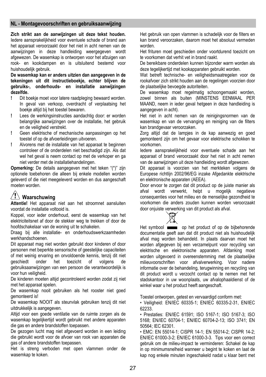 Zich strikt aan de aanwijzingen uit deze tekst houden. dedere aansprakelijkheid voor eventuele schade of brand aan het apparaat veroorzaakt door het Niet in acht nemen van de aanwijzingen in deze handleiding weergegeven worden afgewezen. De wasemkap is ontworpen voor het afzuiigen van rook- en kookdampen en isuitsluitend bestemd voor huishoudelijk gebruik.