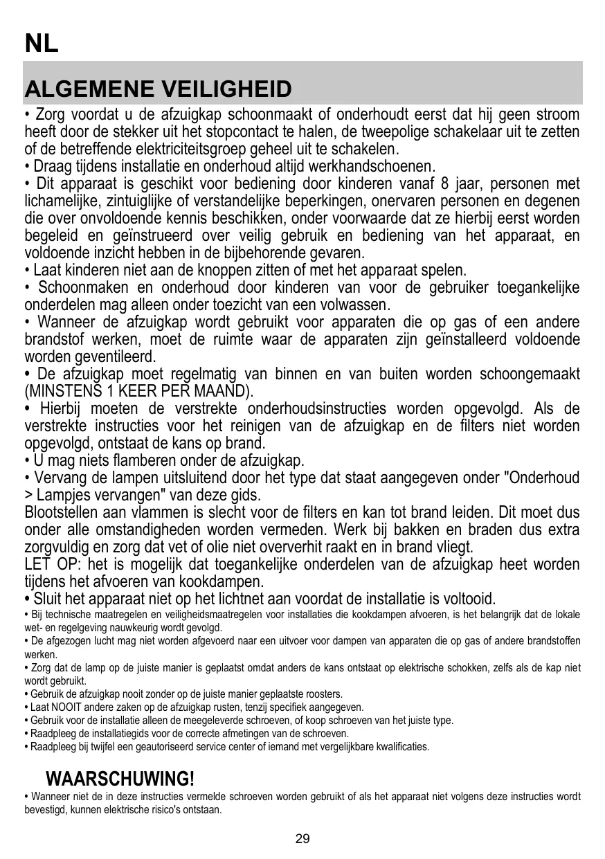• Anders, contacteer onze Klantenservice (Het telefoonnummer staat in het garantieboekje). • Para la sustitución de la lámpara sólo utilizar el tipo de lámpara indicado en la sección de mantenimiento/sustitución de este manual. El uso de una llama libre es perjudicial para los filtros y puede provocar incendios, por lo tanto, debe evitarse en cualquier caso. Los fritos debe realizarse con cuidado para evitar que el aceite caliente prenda fuego. ATENCIÓN: Cuando la placa de cocción está funcionando las partes accesibles de la campana pueden calentarse. • No conectar la unidad a la red eléctrica hasta que la instalación sea totalmente completada.