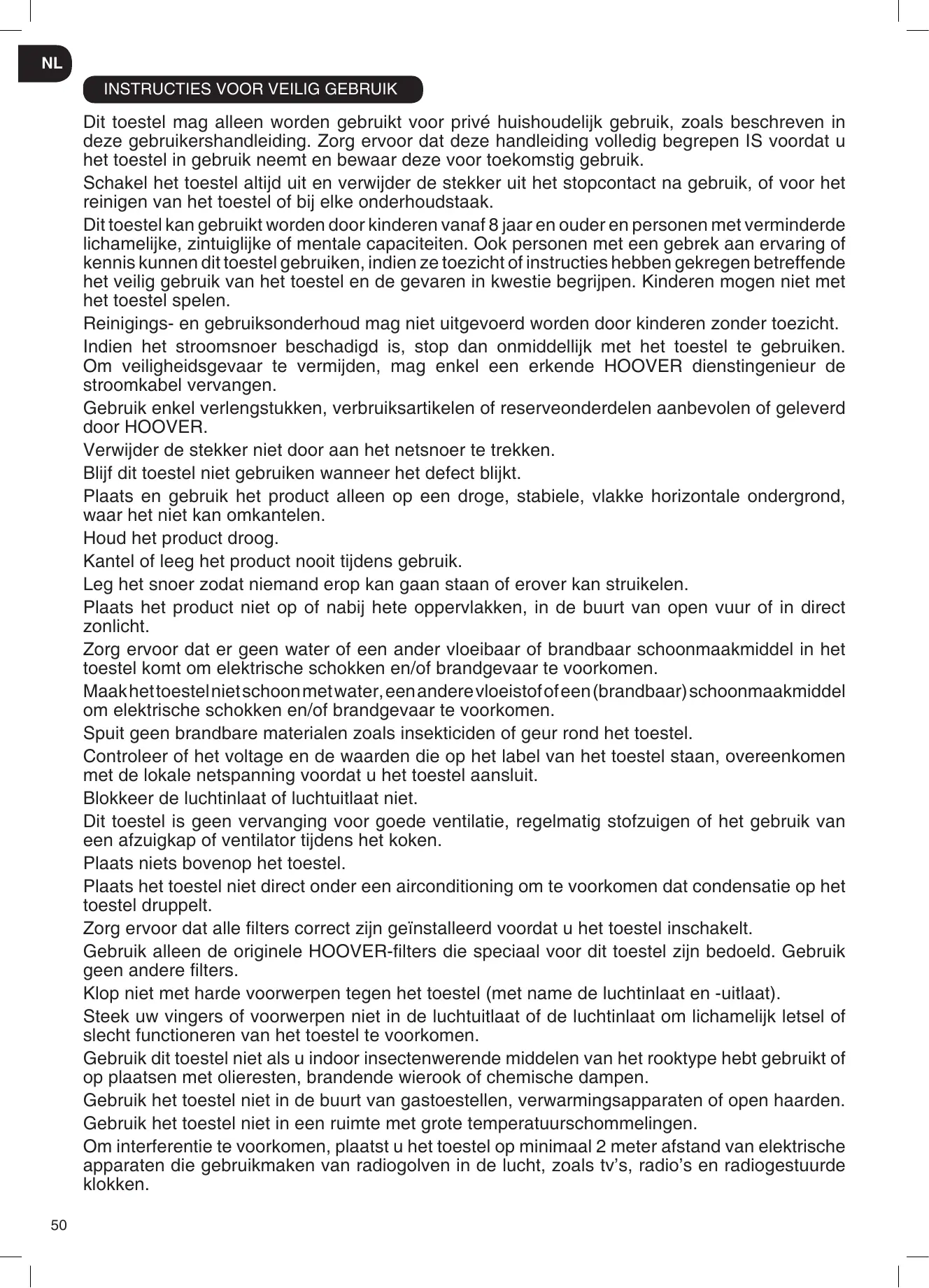 Le nettoyage et l’entretien ne devraient pas être effectués par des enfants sans supervision. Si le cordon d’alimentation est endommagé, arrêtez immédiatement d’utiliser l’appareil. Pour éviter les risques d’accident, un réparateur HOOVER agréé doit remplacer le cordon d’alimentation. N’utilisez que les accessoires, consommables ou pièces détachées recommandés ou fournis par HOOVER. Ne débranchez pas l’appareil en tirant le cordon d’alimentation. Ne continuez pas à utiliser votre appareil s’il semble défectueux. Placez et utilisez l’appareil uniquement sur une surface sèche, stable et à l’horizontale afin d’éviter le basculement. Gardez l’appareil sec. N’inclinez ou ne videz jamais l’appareil pendant le fonctionnement. Posez le cordon d’alimentation de façon à ce que personne ne le piétine ou n’y trébuche. Ne placez pas l’appareil sur des surfaces chaudes, près de surfaces chaudes, près de feux ouverts ou directement exposé aux rayons du soleil. Ne laissez pas que de l’eau ou tout autre liquide ou détergent inflammable pénètre dans l’appareil pour éviter tout risque d’électrocution et/ou d’incendie. Ne nettoyez pas l’appareil avec de l’eau, tout autre liquide ou un détergent (inflammable) pour éviter tout risque d’électrocution et/ou d’incendie. Ne vaporisez pas de produits inflammables comme des insecticides ou des parfumeurs autour de l’appareil. Vérifiez si la tension et les puissances indiquées sur l’étiquette de l’appareil correspondent à la tension d’alimentation locale avant de brancher l’appareil. Ne bloquez pas l’entrée ou la sortie de l’air. Cet appareil ne remplace pas une ventilation correcte, un nettoyage régulier avec l’aspirateur ou l’utilisation d’une hotte aspirante ou d’un ventilateur pendant que vous cuisinez. Ne placez rien sur l’appareil. Ne placez pas l’appareil directement en dessous d’un climatiseur pour éviter que le condensat dégouline dans l’appareil. Assurez-vous que les filtres soient convenablement montés avant d’allumer l’appareil. Utilisez uniquement les filtres originaux HOOVER spécifiques pour cet appareil. N’utilisez pas d’autres filtres. Évitez de frapper contre l’appareil (l’entrée et la sortie de l’air en particulier) avec des objets durs. N’enfilez pas vos doigts ou des objets dans la sortie de l’air ou dans l’entrée de l’air pour éviter des blessures ou un dysfonctionnement de l’appareil. N’utilisez pas cet appareil quand vous avez utilisez des répulsifs pour insectes à fumée intérieure ou dans des endroits avec des résidus d’huile, de l’encens brûlant ou des fumées chimiques. N’utilisez pas cet appareil près d’appareils à gaz, de dispositifs chauffants ou des cheminées. N’utilisez pas l’appareil dans une chambre avec des changements de températures importants. Pour éviter les interférences, placez l’appareil au moins à 2 m de tout appareil électrique qui utilise les ondes radio aériennes comme les TV, les radios et les horloges radio-pilotées. Quand l’appareil n’est pas utilisé pendant longtemps, des bactéries peuvent proliférer sur les 14