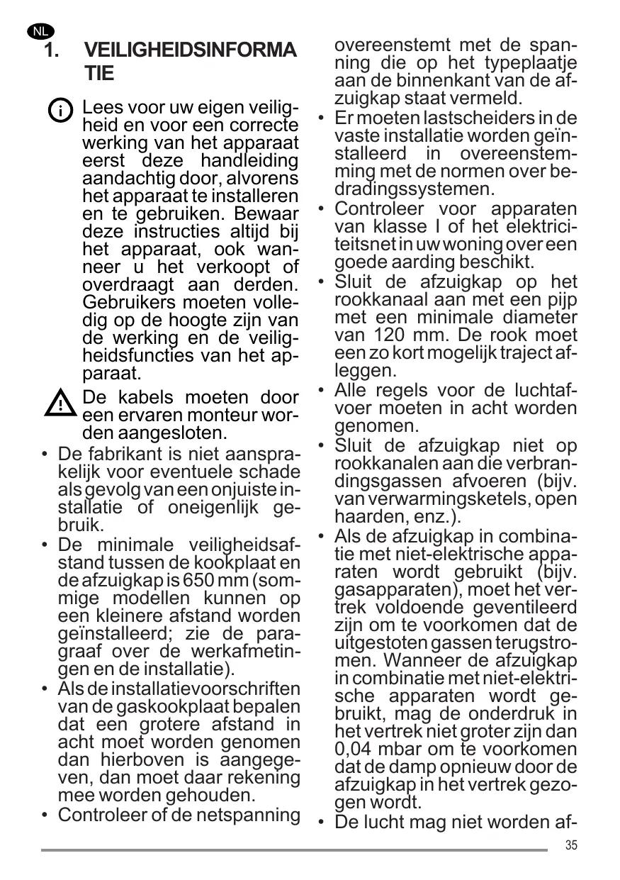 Pour les appareils de Classe I, s’assurer que l’installation électrique de votre intérieur dispose d’une mise à la terre adéquate Relier la hotte au conduit de cheminée avec un tube ayant un diamètre minimum de 120 mm. Le parcours des fumées doit être le plus court possible. Respecter toutes les normes concernant l’évacuation de l’air. Ne pas relier la hotte aspirante aux conduits de cheminée qui acheminent les fumées de combustion (par ex. de chaudières, de cheminées, etc.). Si vous utilisez l’aspirateur en même temps que des appareils non électriques (par ex. appareils à gaz), veillez à ce que la pièce soit adéquatement ventilée, afin d’empêcher le retour du flux des gaz d’évacuation. Si vous utilisez la hotte de cuisine en même temps que des appareils non alimentés à l’électricité, la pression négative dans la pièce ne doit pas dépasser 7