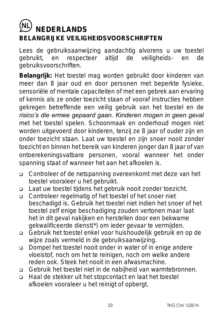 Controleer of de netspanning overeenkomt met deze van het toestel vooraleer u het gebruikt. Laat uw toestel tijdens het gebruik nooit zonder toezicht. Controleer regelmatig of het toestel of het snoer niet beschadigd is. Gebruik het toestel niet indien het snoer of het toestel zelf enige beschadiging zouden vertonen maar laat het in dit geval nakijken en herstellen door een bekwame gekwalificeerde dienst(*) om ieder gevaar te vermijden. Gebruik het toestel enkel voor huishoudelijk gebruik en op de wijze zoals vermeld in de gebruiksaanwijzing. Dompel het toestel nooit onder in water of in enige andere vloeistof, noch om het te reinigen, noch om welke andere reden ook. Steek het nooit in een afwasmachine. Gebruik het toestel niet in de nabijheid van warmtebronnen. Haal de stekker uit het stopcontact en laat het toestel afkoelen vooraleer u het reinigt of opbergt. 23
