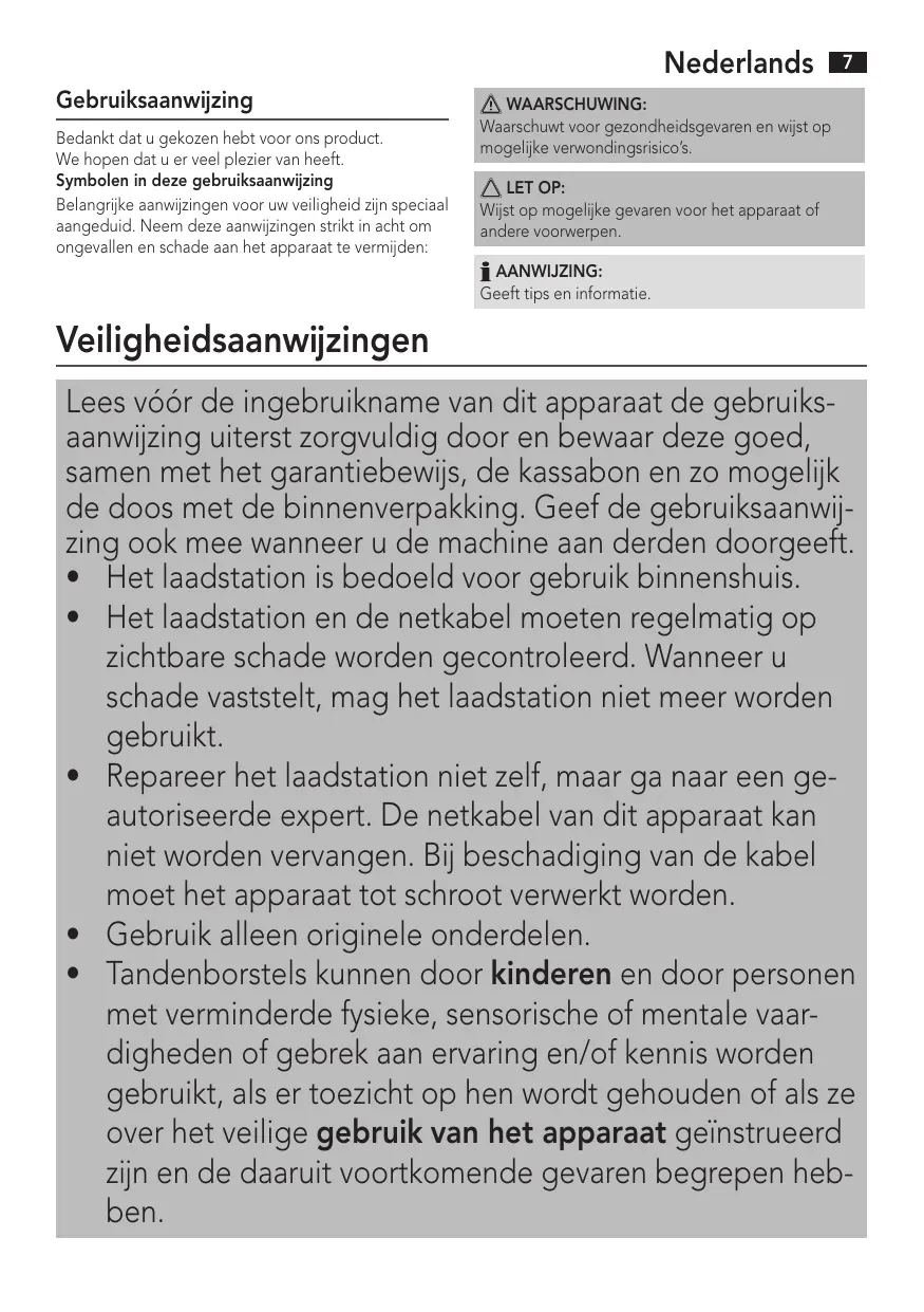 A d’emploi et conservez-le ainsi que le bon de garantie, votre ticket de caisse et si possible, le carton avec l’emballage se trouvant à l’intérieur. Assurez-vous de joindre ce mode d’emploi si vous transmettez l’appareil à un tiers. • La station de charge est conçue pour une utilisation en intérieur. • La station de charge et le câble d’alimentation doivent être régulièrement inspectés pour détecter la présence de signes d’endommagement. La station de charge ne doit plus être utilisée si des dommages sont constatés. • Ne pas réparer la station de charge soi-même, l’amener à un technicien agréé. Le câble d’alimentation de cet appareil ne peut pas être remplacé. Si le câble est endommagé, l’appareil entier doit être mis au rebut. • Utilisez exclusivement des accessoires d’origine. • Les brosses à dents peuvent être utilisées par des enfants et des déficients physiques, sensoriels ou mentaux, et des personnes ayant peu de connaissances et/ou d’expérience, à la condition qu’ils soient surveillés, ou sachent comment les utiliser en toute sécurité, et qu’ils aient compris les risques encourus.
