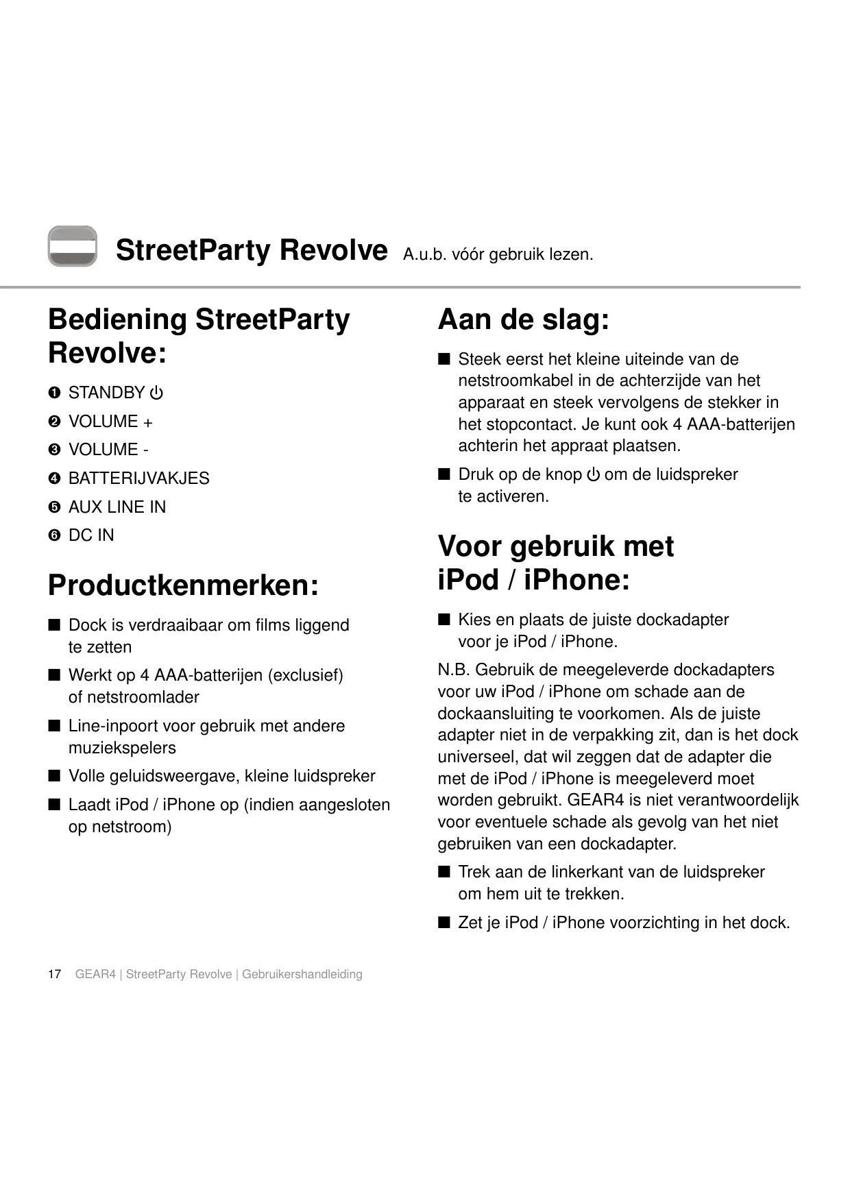 Copyright © 2010 Disruptive Limited. Alle rechten voorbehouden. Volledige of gedeeltelijke reproductie is verboden. GEAR4 en StreetParty zijn gedeponeerde handelsmerken van Disruptive Limited. iPhone, iPod, iPod nano, iPod classic en iPod touch zijn handelsmerken van Apple Inc., gedeponeerd in de VS en andere landen. ‘Made for iPod’ en 'Made for iPhone' betekenen dat een elektronische accessoire zodanig is ontworpen dat het specifiek op een iPod of iPhone past en dat het door de ontwikkelaar is gecertificeerd om te voldoen aan de prestatieverwachtingen van Apple. Apple is niet verantwoordelijk voor de werking van dit apparaat of de naleving van veiligheidsen regelgevingsstandaarden. Waarschuwing Blootstelling van dit apparaat aan regen of vocht kan brand of een elektrische schok veroorzaken. Voorzichtig Gebruik van besturingsknoppen of aanpassing van prestaties of procedures anders dan hier beschreven, kan resulteren in gevaarlijke stralingsblootstelling.