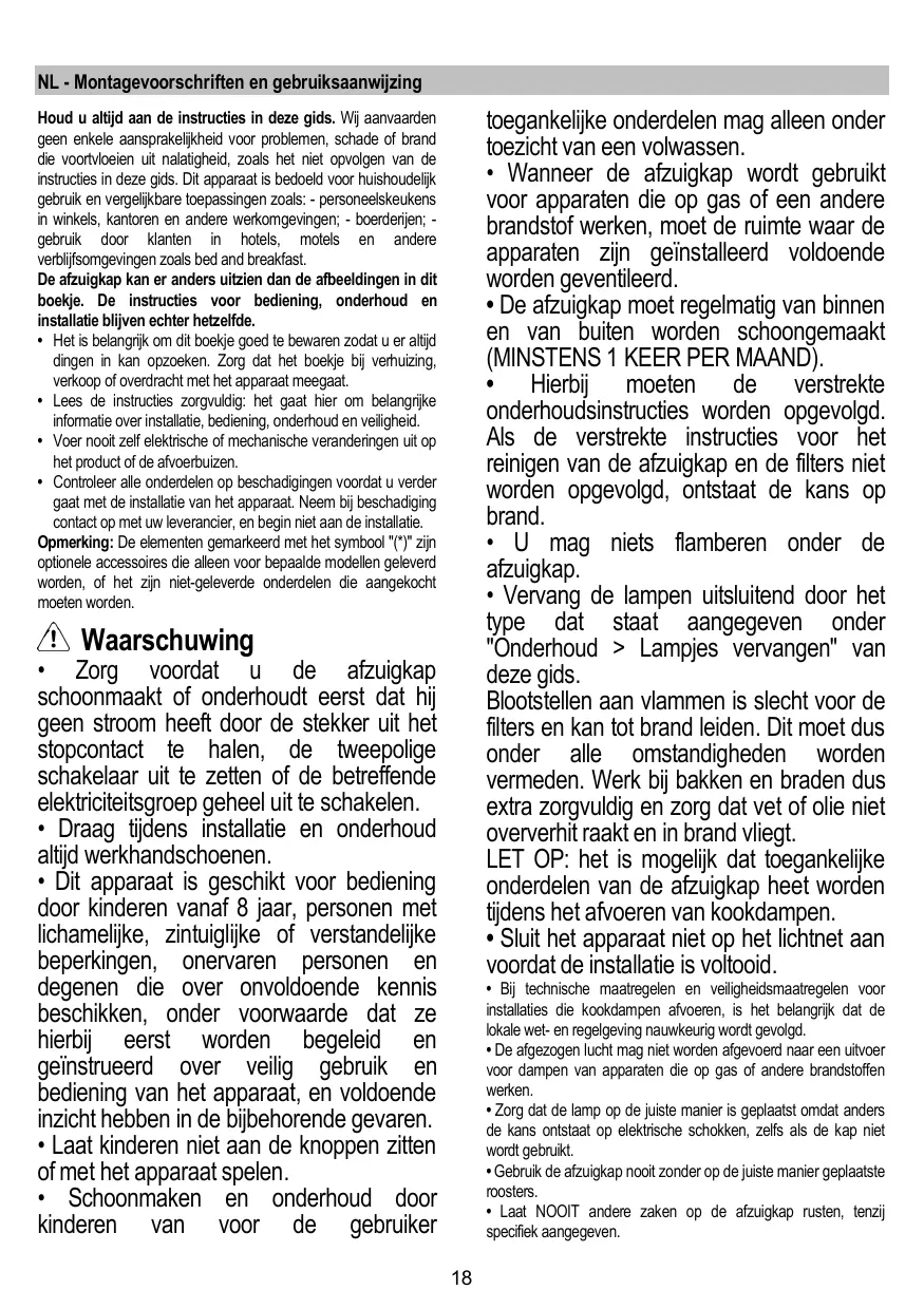 FR Notice de montage et mode d’emploi NL Montagevoorschriften en gebruiksaanwijzingen ES Montaje y modo de empleo PT Instruções para montagem e utilização EL ΟΔΗΓΙΕΣ ΣΥΝΑΡΜΟΛΟΓΗΣΗΣ ΚΑΙ ΧΡΗΣΗΣ • La hotte doit être régulièrement nettoyée à la fois à l'intérieur et à l'extérieur (AU MOINS UNE FOIS PAR MOIS); cela devrait se faire en conformité avec les instructions d'entretien. Le non respect des instructions expressément fournies concernant le nettoyage de la hotte et des filtres peut provoquer des risques d'incendie. • Ne pas flamber d’aliments sous la hotte. • Pour le remplacement de la lampe, utilisez uniquement le type de lampe spécifié dans la section remplacement/maintenance lampe dans ce manuel. L'utilisation d'une flamme nue est dommageable pour les filtres et peut causer un incendie, par conséquent, il est déconseillé de l'utiliser. La friture doit être faite avec soin afin de s’assurer que l’huile surchauffée ne prenne pas feu. AVERTISSEMENT: Lorsque la table de cuisson est en fonctionnement, les parties accessibles de la hotte peuvent devenir très chaudes. • Ne pas brancher l'appareil au réseau électrique avant que l'installation ne soit complètement terminée.