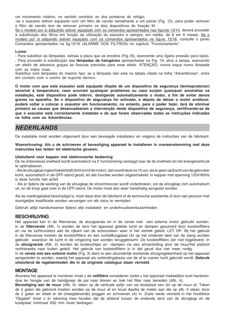 De motor die in deze wasemkap worden gebrukt is voorzien van een veiligheidsvoorziening (hittebeveiliging) die gevoelig is voor de temperatuur; om teovallige redenen of wedgens afwijkingen in de installmentie zou deze voorziening kannen ingrijpen door de motor automatisch uit te schakelen, om ernstige schade aan het apparaat te vermijden. In deze gevallen kan de wasemkap opniew worden ingeschakeld nadat de motor is afgekoeld; de oorzaken van de storing dienenECHTER te worden opgeheven dor na te gaan of de installmentie correct is uitgevoerd en te controleren alle instructies uit het blad met Waarschuwingen zijn opgevolgd.