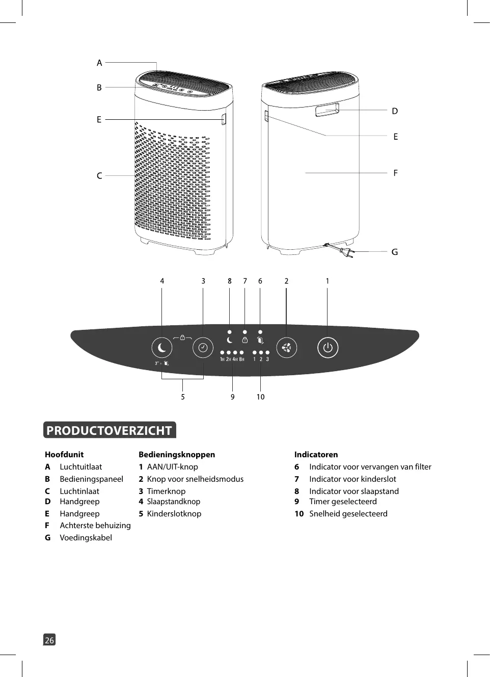 6 Indicateur de remplacement de filtre 7 Indicateur de la sécurité enfants 8 Indicateur de mode veille 9 Minuteur sélectionné 10 Vitesse sélectionnée