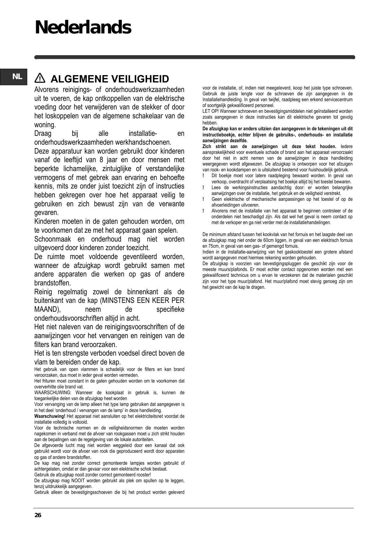 La pièce doit avoir une aération suffisante lorsque la hotte est utilisée conjointement avec d'autres appareils fonctionnant au gaz ou autres combustibles. La hotte doit être régulièrement nettoyée à la fois à l'intérieur et à l'extérieur (AU MOINS UNE FOIS PAR MOIS); cela devrait se faire en conformité avec les instructions d'entretien. Le non respect des instructions expressément fournies concernant le nettoyage de la hotte et des filtres peut provoquer des risques d'incendie. Ne pas flamber d’aliments sous la hotte.