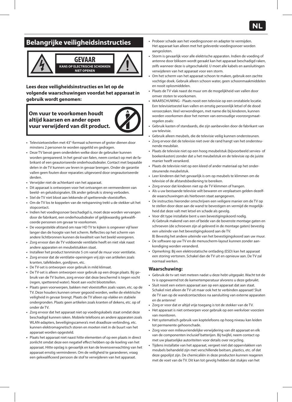 Om vuur te voorkomen houdt altijd kaarsen en ander open vuur verwijderd van dit product. • Televisietoestellen met 43"-formaat schermen of groter dienen door minstens 2 personen te worden opgetild en gedragen. • Deze TV bevat geen onderdelen welke door de gebruiker kunnen worden gerepareerd. In het geval van falen, neem contact op met de fabrikant of een geautoriseerde onderhoudsdealer. Contact met bepaalde delen in de TV kunnen uw leven in gevaar brengen. Onder de garantie vallen geen fouten door reparaties uitgevoerd door ongeautoriseerde derden. • Verwijder niet de achterkant van het apparaat. • Dit apparaat is ontworpen voor het ontvangen en vermeerderen van beeld- en geluidssignalen. Elk ander gebruik is streng verboden. • Stel de TV niet bloot aan lekkende of spetterende vloeistoffen. • Om de TV los te koppelen van de netspanning trekt u de stekker uit het stopcontact. • Indien het voedingssnoer beschadigd is, moet deze worden vervangen door de fabrikant, een onderhoudsdealer of gelijkwaardig gekwalificeerde personen om gevaar te voorkomen. • De voorgestelde afstand om naar HD TV te kijken is ongeveer vijf keer langer dan de hoogte van het scherm. Reflecties op het scherm van andere lichtbronnen kunnen de kwaliteit van het beeld verergeren. • Zorg ervoor dan de TV voldoende ventilatie heeft en niet vlak naast andere apparaten en meubelstukken staat. • Installeer het product tenminste 5 cm vanaf de muur voor ventilatie. • Zorg ervoor dat de ventilatie-openingen vrij zijn van artikelen zoals kranten, tafelkleden, gordijnen, etc. • De TV-set is ontworpen voor gebruik in mild klimaat. • De TV-set is alleen ontworpen voor gebruik op een droge plaats. Bij gebruik van de TV buiten, zorg ervoor dat deze beschermd is tegen vocht (regen, spetterend water). Nooit aan vocht blootstellen. • Plaats geen voorwerpen, bakken met vloeistoffen zoals vazen, etc. op de TV. Deze houders kunnen omver gegooid worden, welke de elektrische veiligheid in gevaar brengt. Plaats de TV alleen op vlakke en stabiele ondergronden. Plaats geen artikelen zoals kranten of dekens, etc. op of onder de TV. • Zorg ervoor dat het apparaat niet op voedingskabels staat omdat deze beschadigd kunnen raken. Mobiele telefoons an andere apparaten zoals WLAN-adapters, beveiligingscamera’s met draadloze verbinding, etc. kunnen elektromagnetisch storen en moeten niet in de buurt van het apparaat worden opgesteld. • Plaats het apparaat niet naast hitte elementen of op een plaats in direct zonlicht omdat deze een negatief effect hebben op de koeling van het apparaat. Hitte opslag is gevaarlijk en kan de levensverwachting van het apparaat ernstig verminderen. Om de veiligheid te garanderen, vraag een gekwalificeerd persoon de stof te verwijderen van het apparaat.