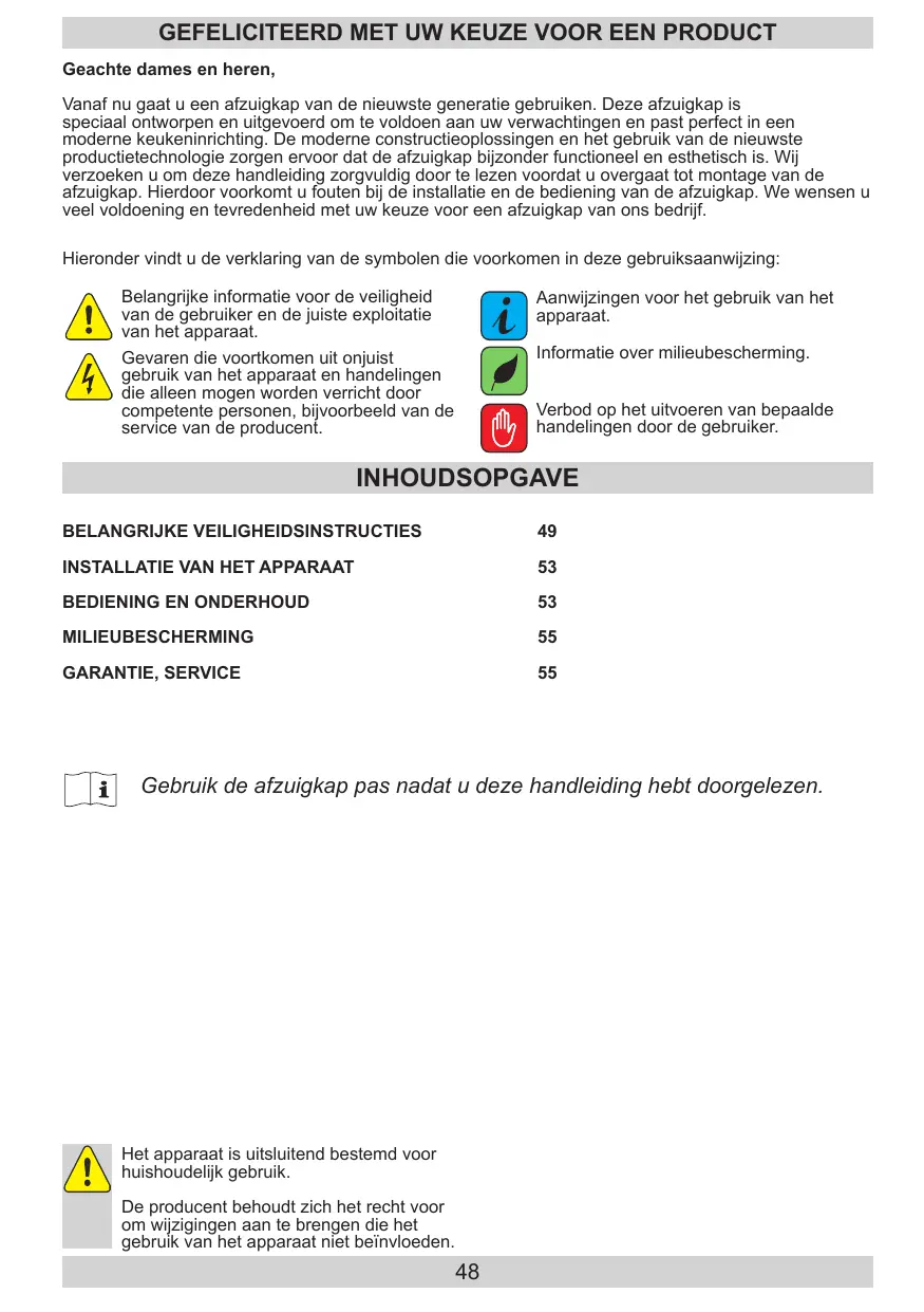 Gebruik de afzuigkap pas nadat u deze handleiding hebt doorgelezen. Het apparaat is uitsluitend bestemd voor huishoudelijk gebruik. De producent behoudt zich het recht voor om wijzigingen aan te brengen die het gebruik van het apparaat niet beïnvloeden.