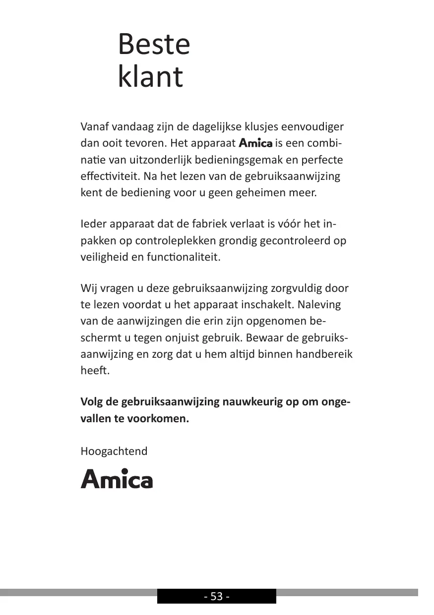 Vanaf vandaag zijn de dagelijkse klusjes eenvoudiger dan ooit tevoren. Het apparaat Amica is een combinatie van uitzonderlijk bedieningsgemak en perfecte effectiviteit. Na het lezen van de gebruiksaanwijzing kent de bediening voor u geen geheimen meer.