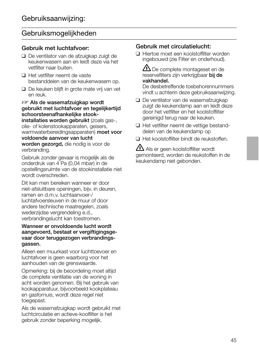 Dit kan men bereiken wanneer er door niet-afsluitbare openingen, bijv. in deuren, ramen en d.m.v. luchtaanvoer-/ luchtafvoersleuven in de muur of door andere technische maatregelen, zoals wederzijdse vergrendeling e.d., verbrandingslucht kan toestromen. Wanneer er onvoldoende lucht wordt aangevoerd, bestaat er vergiftigingsgevaar door teruggezogen verbrandingsgassen. Alleen een muurkast voor luchttoevoer en luchtafvoer is geen waarborg voor het aanhouden van de grenswaarde. Opmerking: bij de beoordeling moet altijd de complete ventilatie van de woning in acht worden genomen. Bij het gebruik van kookapparatuur, bijvoorbeeld kookplateau en gasfornuis, wordt deze regel niet toegepast. Als de wasemafzuigkap wordt gebruikt met luchtcirculatie en actieve-koolfilter is het gebruik zonder beperking mogelijk. Als de afvoerlucht door de buitenmuur wordt geleid, moet een telescoop-muurkast worden gebruikt.