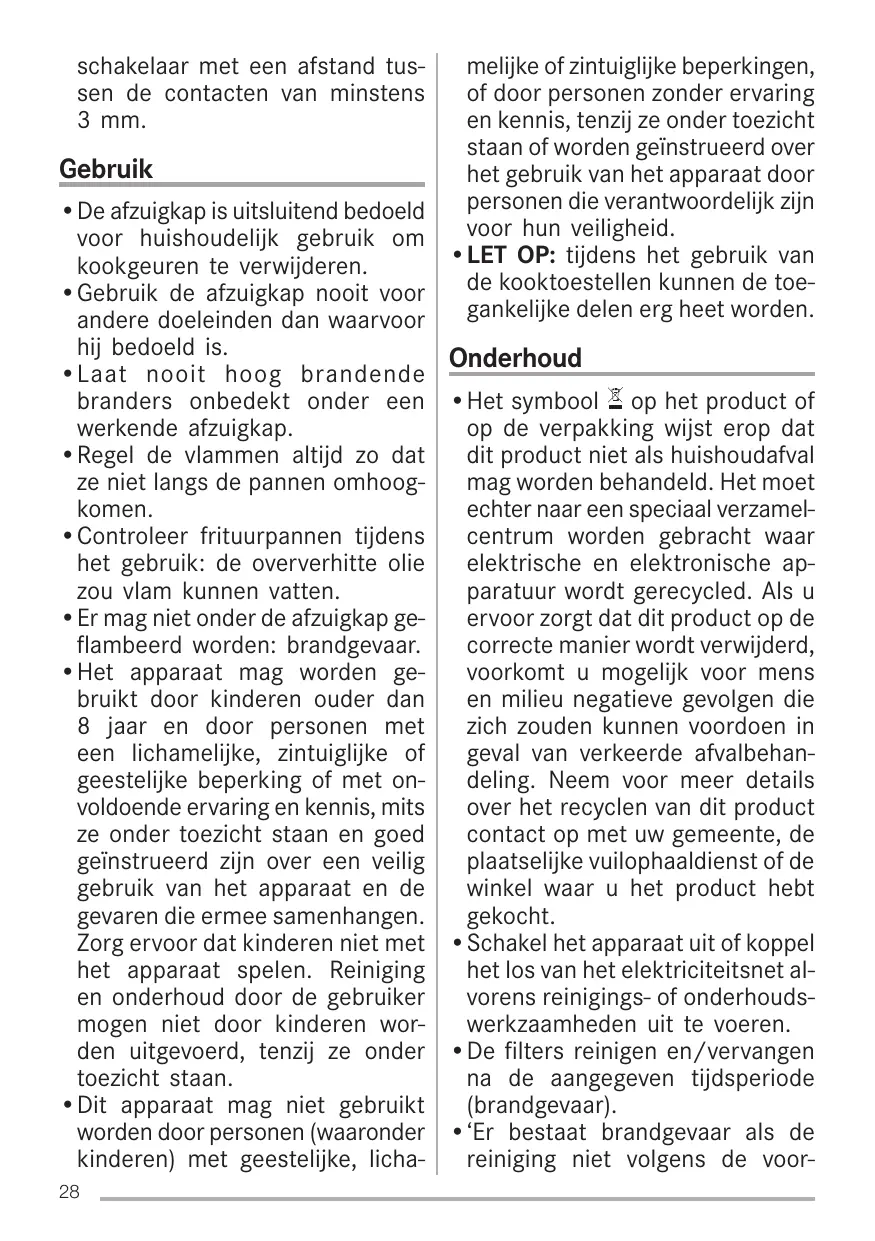Gebruik •De afzuigkap is uitsluitend bedoeld voor huishoudelijk gebruik om kookgeuren te verwijderen. •Gebruik de afzuigkap nooit voor andere doeleinden dan waarvoor hij bedoeld is. •Laat nooit hoog brandende branders onbedekt onder een werkende afzuigkap. •Regel de vlammen altijd zo dat ze niet langs de pannen omhoogkomen. •Controleer frituurpannen tijdens het gebruik: de oververhitte olie zou vlam kunnen vatten. •Er mag niet onder de afzuigkap geflambeerd worden: brandgevaar. •Het apparaat mag worden gebruikt door kinderen ouder dan 8 jaar en door personen met een lichamelijke, zintuiglijke of geestelijke beperking of met onvoldoende ervaring en kennis, mits ze onder toezicht staan en goed geïnstrueerd zijn over een veilig gebruik van het apparaat en de gevaren die ermee samenhangen. Zorg ervoor dat kinderen niet met het apparaat spelen. Reiniging en onderhoud door de gebruiker mogen niet door kinderen worden uitgevoerd, tenzij ze onder toezicht staan. •Dit apparaat mag niet gebruikt worden door personen (waaronder kinderen) met geestelijke, licha28