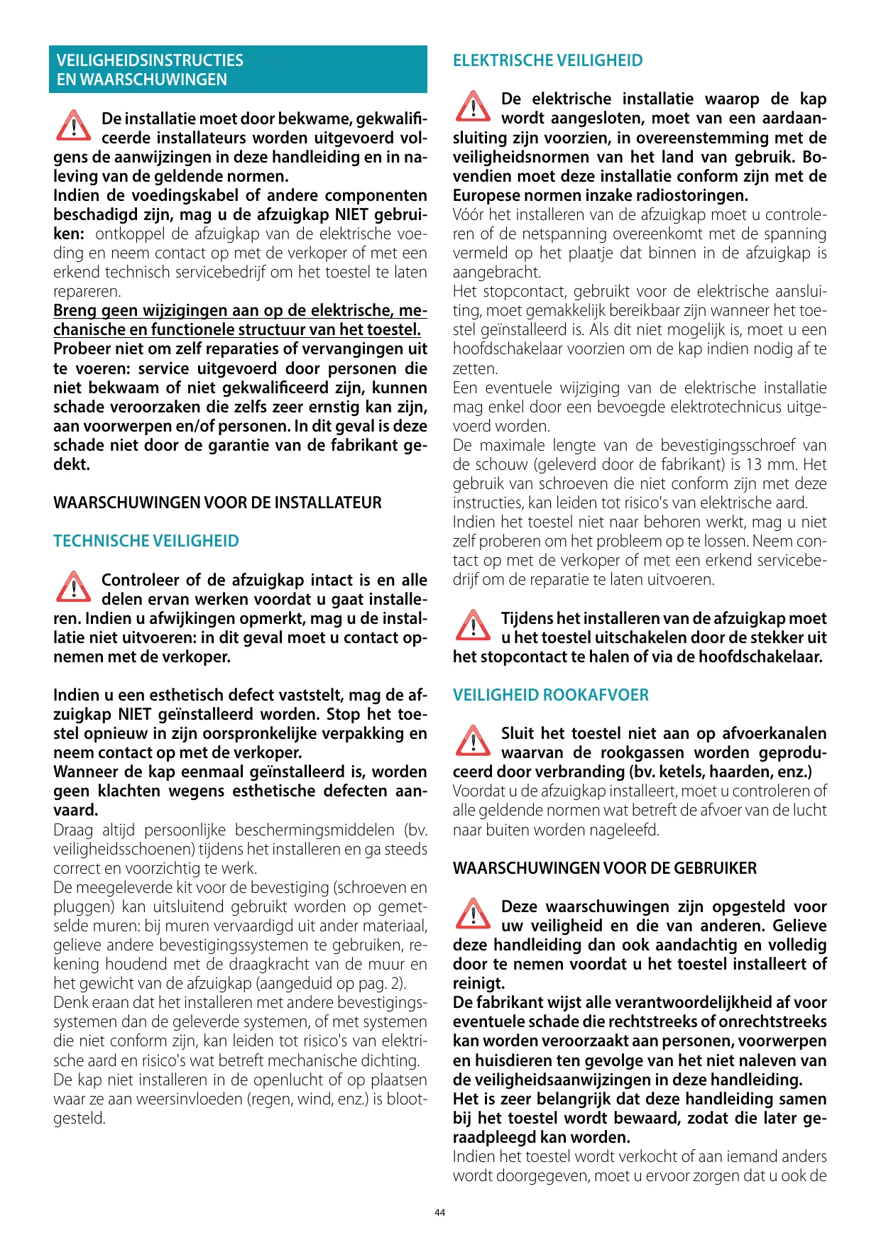 Deze waarschuwingen zijn opgesteld voor uw veiligheid en die van anderen. Gelieve deze handleiding dan ook aandachtig en volledig door te nemen voordat u het toestel installeert of reinigt. De fabrikant wijst alle verantwoordelijkheid af voor eventuele schade die rechtstreeks of onrechtstreeks kan worden veroorzaakt aan personen, voorwerpen en huisdieren ten gevolge van het niet naleven van de veiligheidsaanwijzingen in deze handleiding. Het is zeer belangrijk dat deze handleiding samen bij het toestel wordt bewaard, zodat die later geraadpleegd kan worden. Indien het toestel wordt verkocht of aan iemand anders wordt doorgegeven, moet u ervoor zorgen dat u ook de