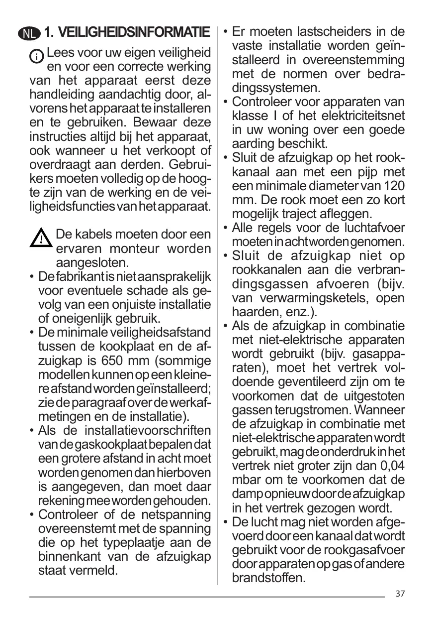 • De ruimte moet voldoende geventileerd zijn als de afzuigkap tegelijk met apparaten op gas of andere brandstoffen wordt gebruikt (niet van toepassing op apparaten die alleen lucht in de ruimte blazen).