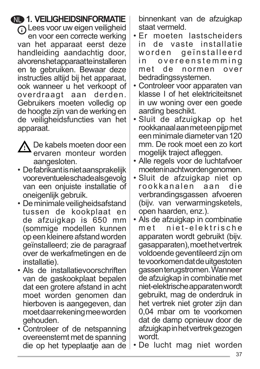 Les dispositifs de sectionnement doivent être montés dans l’installation fixe conformément aux normes sur les systèmes de câblage. Pour les appareils de Classe I, s’assurer que l’installation électrique de votre intérieur dispose d’une mise à la terre adéquate. Reliez l’aspirateur du conduit de cheminée avec un tube ayant un diamètre minimum de 120 mm. Le parcours des fumées doit être le plus court possible. Respecter toutes les normes concernant l’évacuation de l’air. Ne reliez pas la hotte aspirante aux conduits de cheminée qui acheminent les fumées de combustion (par ex. de chaudières, de cheminées, etc.). Si vous utilisez l’aspirateur en même temps que des appareils non électriques (par ex. fonctionnant au gaz), veillez à ce que la pièce soit adéquatement ventilée, afin d’empêcher le retour du flux des gaz d’évacuation. Si vous utilisez la hotte de cuisine en même temps que des appareils non alimentés à l’électricité, la pression négative dans la pièce ne doit pas dépasser 0,04 mbar, afin d’éviter que les fumées