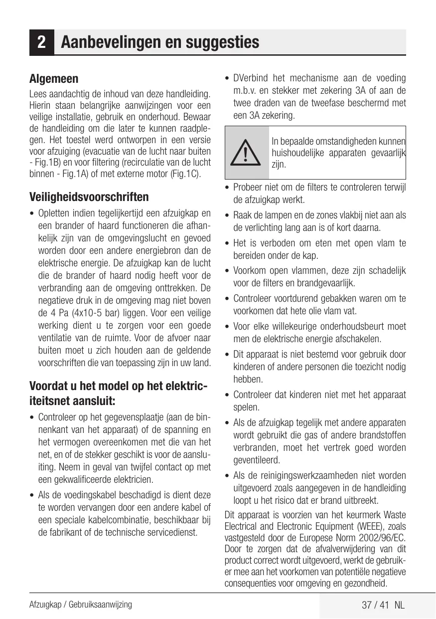 - We raden aan het apparaat aan te zetten voordat u met de bereiding begint van elke willekeurige maaltijd. We raden u aan het apparaat 15 minutes aan te laten nadat het eten bereid is, voor een optimale luchtverversing. De goede werkung van de afzuigkap hangt af van een regelmatig en correct onderhoud; in het bijzonder要去 men aandacht besteden aan het vetfilter en aan het filter met actieve koolstof.