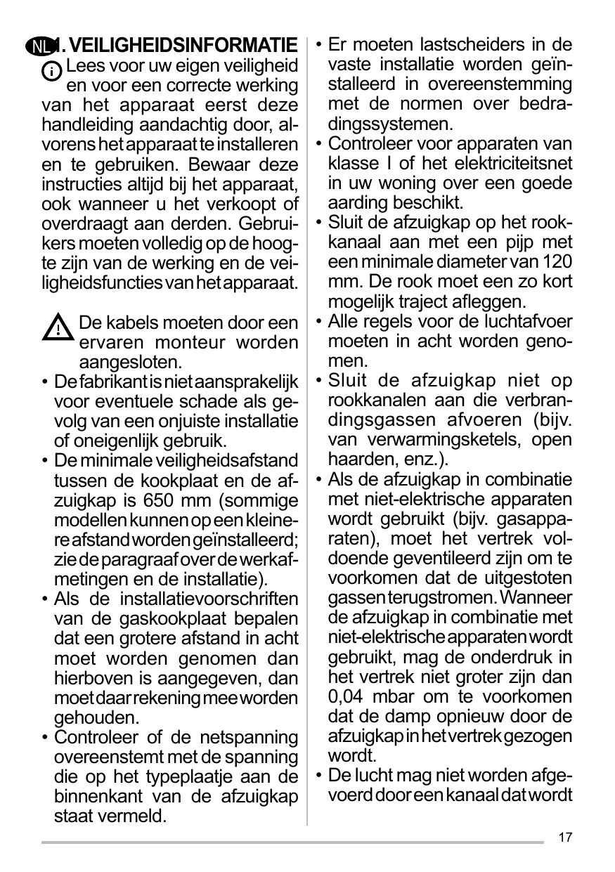 • De ruimte moet voldoende geventileerd zijn als de afzuigkap tegelijk met apparaten op gas of andere brandstoffen wordt gebruikt (niet van toepassing op