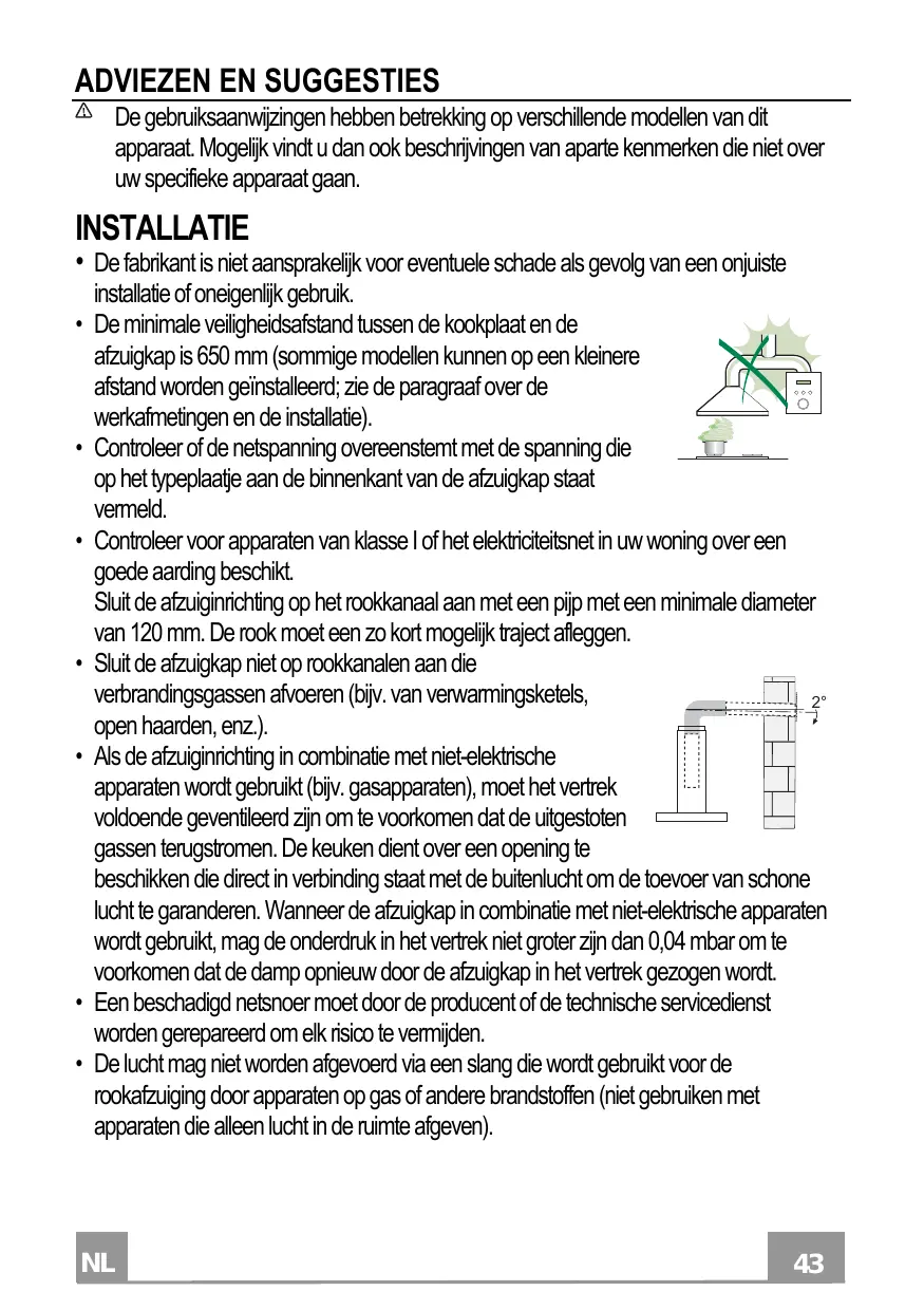 • La distance de sécurité minimum entre le plan de cuisson et la hotte aspirante est de 650 mm (certains modèles peuvent être installés à une hauteur inférieure ; voir le paragraphe concernant les dimensions de travail et l’installation). • Assurez-vous que la tension de votre secteur correspond à celle indiquée sur la plaque des données appliquée à l’intérieur de la hotte. • Pour les appareils de Classe I, s’assurer que l’installation électrique de votre intérieur dispose d’une mise à la terre adéquate. Relier l’aspirateur au conduit de cheminée avec un tube d’un diamètre minimum de 120 mm. Le parcours des fumées doit être le plus court possible. • Ne pas relier la hotte aspirante aux conduits de cheminée qui 2° acheminent les fumées de combustion (par exemple de chaudières, de cheminées, etc.). • Si vous utilisez l’aspirateur en combinaison avec des appareils non électriques (par ex. appareils à gaz), vous devez garantir un degré d’aération suffisant dans la pièce, afin d’empêcher le retour du flux des gaz de sortie. La cuisine doit présenter une ouverture communiquant directement vers l’extérieur pour garantir l’amenée d’air propre. Si vous utilisez la hotte de cuisine en combinaison avec des appareils non alimentés à l’électricité, la pression négative dans la pièce ne doit pas dépasser 0,04 mbar afin d’éviter que la hotte ne réaspire les fumées dans la pièce. • Ne pas évacuer l’air à travers un tube flexible utilisé pour l’aspiration des fumées des appareils alimentés au gaz ou avec d’autres combustibles (ne pas utiliser avec des appareils ayant une seule sortie d’air dans la pièce). • Si le cordon d’alimentation est endommagé, veuillez le faire remplacer par le fabricant ou par un service après-vente agréé pour éviter tout risque d’accident.