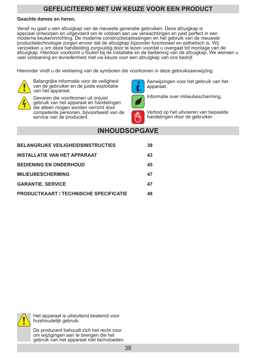GEFELICITEERD MET UW KEUZE VOOR EEN PRODUCT Geachte dames en heren, Vanaf nu gaat u een afzuigkap van de nieuwste generatie gebruiken. Deze afzuigkap is speciaal ontworpen en uitgevoerd om te voldoen aan uw verwachtingen en past perfect in een moderne keukeninrichting. De moderne constructieoplossingen en het gebruik van de nieuwste productietechnologie zorgen ervoor dat de afzuigkap bijzonder functioneel en esthetisch is. Wij verzoeken u om deze handleiding zorgvuldig door te lezen voordat u overgaat tot montage van de afzuigkap. Hierdoor voorkomt u fouten bij de installatie en de bediening van de afzuigkap. We wensen u veel voldoening en tevredenheid met uw keuze voor een afzuigkap van ons bedrijf. Hieronder vindt u de verklaring van de symbolen die voorkomen in deze gebruiksaanwijzing: Belangrijke informatie voor de veiligheid van de gebruiker en de juiste exploitatie van het apparaat. Gevaren die voortkomen uit onjuist gebruik van het apparaat en handelingen die alleen mogen worden verricht door competente personen, bijvoorbeeld van de service van de producent.
