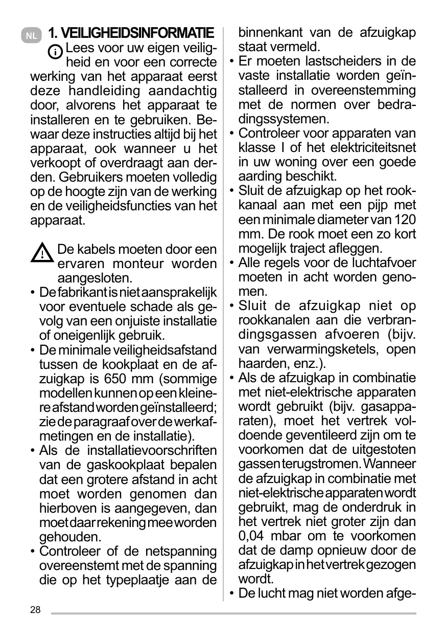 • De ruimte moet voldoende geventileerd zijn als de afzuigkap tegelijk met apparaten op gas of andere brandstoffen wordt 29