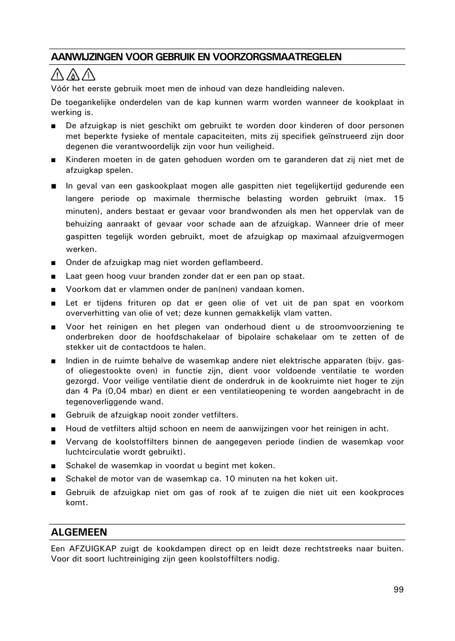 Voor het reinigen en het plegen van onderhoud dient u de stroomvoorzieing te onderbreken door de hoofdschakelaar of bipolaire schakelaar om te zetten of de stekkeruit de contactdoos te halen. - Indien in de ruimte behalte de wasemkap andere nicht elektrische apparaten (bijv. gas-of oliegestookte oven) in functie zich, dient voor voldoende ventilatie te worden gezorgd. Voor veilige ventilatie dient de onderduk in de kookruimte Niet hoger te zich dan 4 Pa (0,04 mbar) en dient er een ventilatieopening te worden aangebracht in de tegenoverliggende wand.