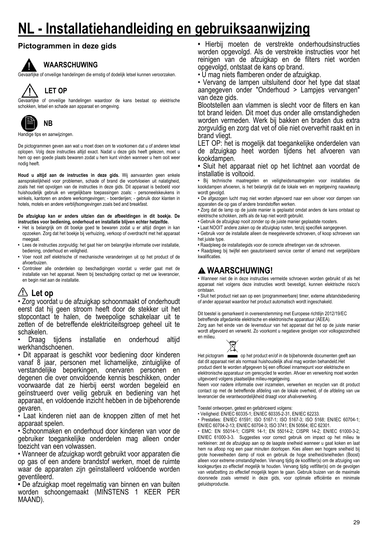 NB Handige tips en aanwijzingen. De pictogrammen geven aan wat u moet doen om te voorkomen dat u of anderen letsel oplopen. Volg deze instructies altijd exact. Nadat u deze gids heeft gelezen, moet u hem op een goede plaats bewaren zodat u hem kunt vinden wanneer u hem ooit weer nodig heeft. Houd u altijd aan de instructies in deze gids. Wij aanvaarden geen enkele aansprakelijkheid voor problemen, schade of brand die voortvloeien uit nalatigheid, zoals het niet opvolgen van de instructies in deze gids. Dit apparaat is bedoeld voor huishoudelijk gebruik en vergelijkbare toepassingen zoals: - personeelskeukens in winkels, kantoren en andere werkomgevingen; - boerderijen; - gebruik door klanten in hotels, motels en andere verblijfsomgevingen zoals bed and breakfast. De afzuigkap kan er anders uitzien dan de afbeeldingen in dit boekje. De instructies voor bediening, onderhoud en installatie blijven echter hetzelfde. • Het is belangrijk om dit boekje goed te bewaren zodat u er altijd dingen in kan opzoeken. Zorg dat het boekje bij verhuizing, verkoop of overdracht met het apparaat meegaat. • Lees de instructies zorgvuldig: het gaat hier om belangrijke informatie over installatie, bediening, onderhoud en veiligheid. • Voer nooit zelf elektrische of mechanische veranderingen uit op het product of de afvoerbuizen. • Controleer alle onderdelen op beschadigingen voordat u verder gaat met de installatie van het apparaat. Neem bij beschadiging contact op met uw leverancier, en begin niet aan de installatie.