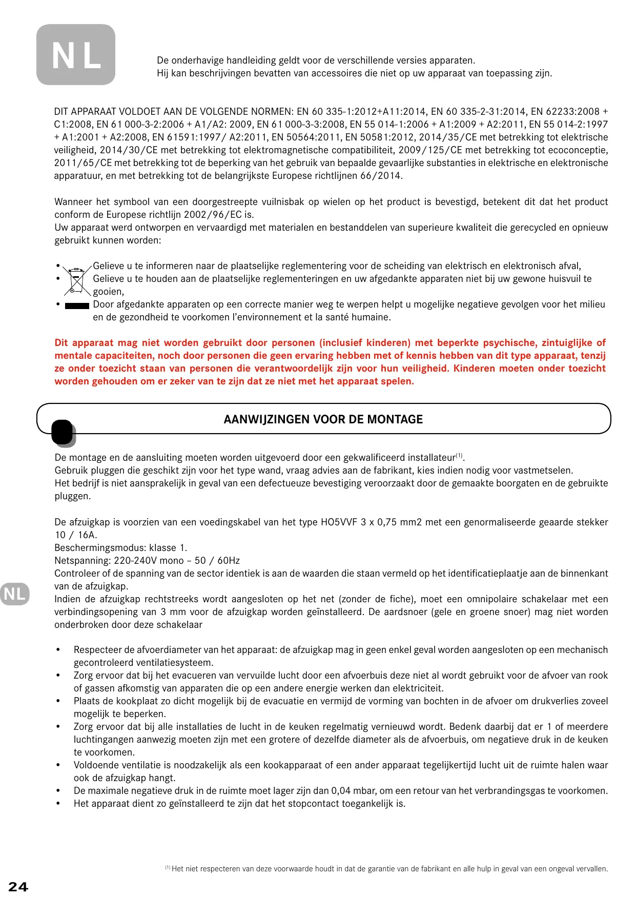 FR La hotte est équipée d’un cordon d’alimentation de type HO5VVF 3 x 0,75 mm² comportant une fiche normalisée 10/16A avec système de mise à la terre.