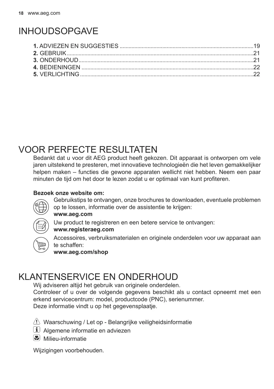 VOOR PERFECTE RESULTATEN Bedankt dat u voor dit AEG product heeft gekozen. Dit apparaat is ontworpen om vele jaren uitstekend te presteren, met innovatieve technologieën die het leven gemakkelijker helpen maken – functies die gewone apparaten wellicht niet hebben. Neem een paar minuten de tijd om het door te lezen zodat u er optimaal van kunt profiteren. Bezoek onze website om: Gebruikstips te ontvangen, onze brochures te downloaden, eventuele problemen op te lossen, informatie over de assistentie te krijgen: www.aeg.com Uw product te registreren en een betere service te ontvangen: www.registeraeg.com Accessoires, verbruiksmaterialen en originele onderdelen voor uw apparaat aan te schaffen: www.aeg.com/shop