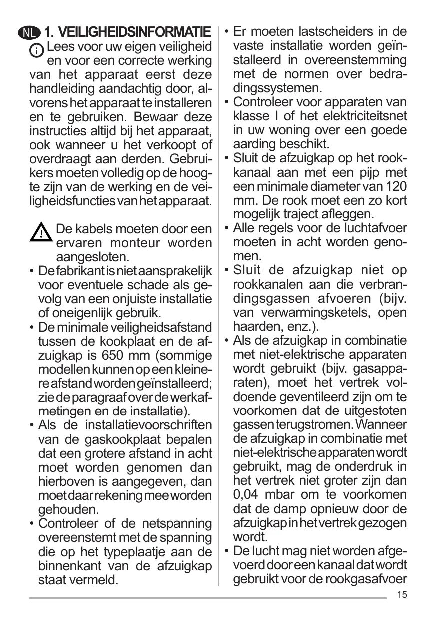 • De ruimte moet voldoende geventileerd zijn als de afzuigkap tegelijk met apparaten op gas of andere brandstoffen wordt gebruikt (niet van toepassing op apparaten die alleen lucht in de
