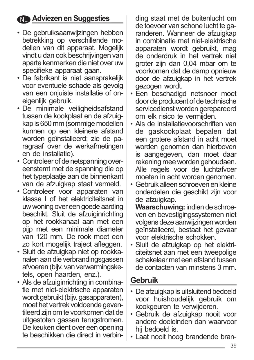 Si le cordon d’alimentation est endommagé, veuillez le faire remplacer par le fabricant ou par un service après-vente agréé pour éviter tout risque d’accident. Si les instructions d’installation du plan de cuisson à gaz spécifient une distance supérieure à celle indiquée ci-dessus, veuillez impérativement en tenir compte. Toutes les normes concernant l’évacuation de l’air doivent être respectées. Utiliser exclusivement des vis et des petites pièces du type adapté pour la hotte. Attention: toute installation des vis et des dispositifs de fixation non conforme aux présentes instructions peut entraîner des risques de décharges électriques. Brancher la hotte à l’alimentation de secteur avec un interrupteur bipolaire ayant une ouverture des contacts d’au moins 3 mm. 9