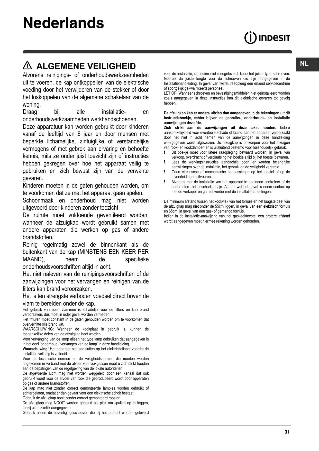 La pièce doit avoir une aération suffisante lorsque la hotte est utilisée conjointement avec d'autres appareils fonctionnant au gaz ou autres combustibles. La hotte doit être régulièrement nettoyée à la fois à l'intérieur et à l'extérieur (AU MOINS UNE FOIS PAR MOIS); cela devrait se faire en conformité avec les instructions d'entretien. Le non respect des instructions expressément fournies concernant le nettoyage de la hotte et des filtres peut provoquer des risques d'incendie. Ne pas flamber d’aliments sous la hotte.