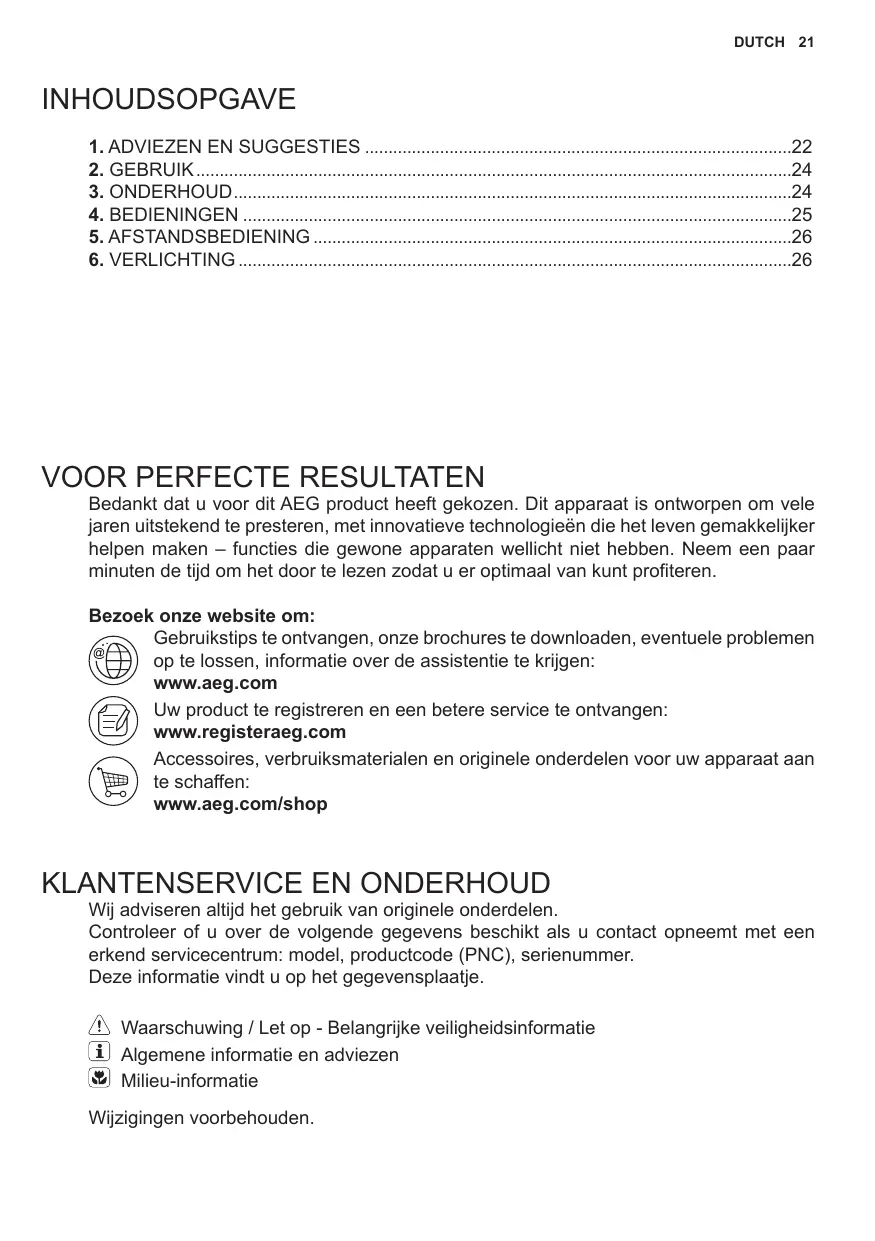VOOR PERFECTE RESULTATEN Bedankt dat u voor dit AEG product heeft gekozen. Dit apparaat is ontworpen om vele jaren uitstekend te presteren, met innovatieve technologieën die het leven gemakkelijker helpen maken – functies die gewone apparaten wellicht niet hebben. Neem een paar minuten de tijd om het door te lezen zodat u er optimaal van kunt profiteren. Bezoek onze website om: Gebruikstips te ontvangen, onze brochures te downloaden, eventuele problemen op te lossen, informatie over de assistentie te krijgen: www.aeg.com Uw product te registreren en een betere service te ontvangen: www.registeraeg.com Accessoires, verbruiksmaterialen en originele onderdelen voor uw apparaat aan te schaffen: www.aeg.com/shop