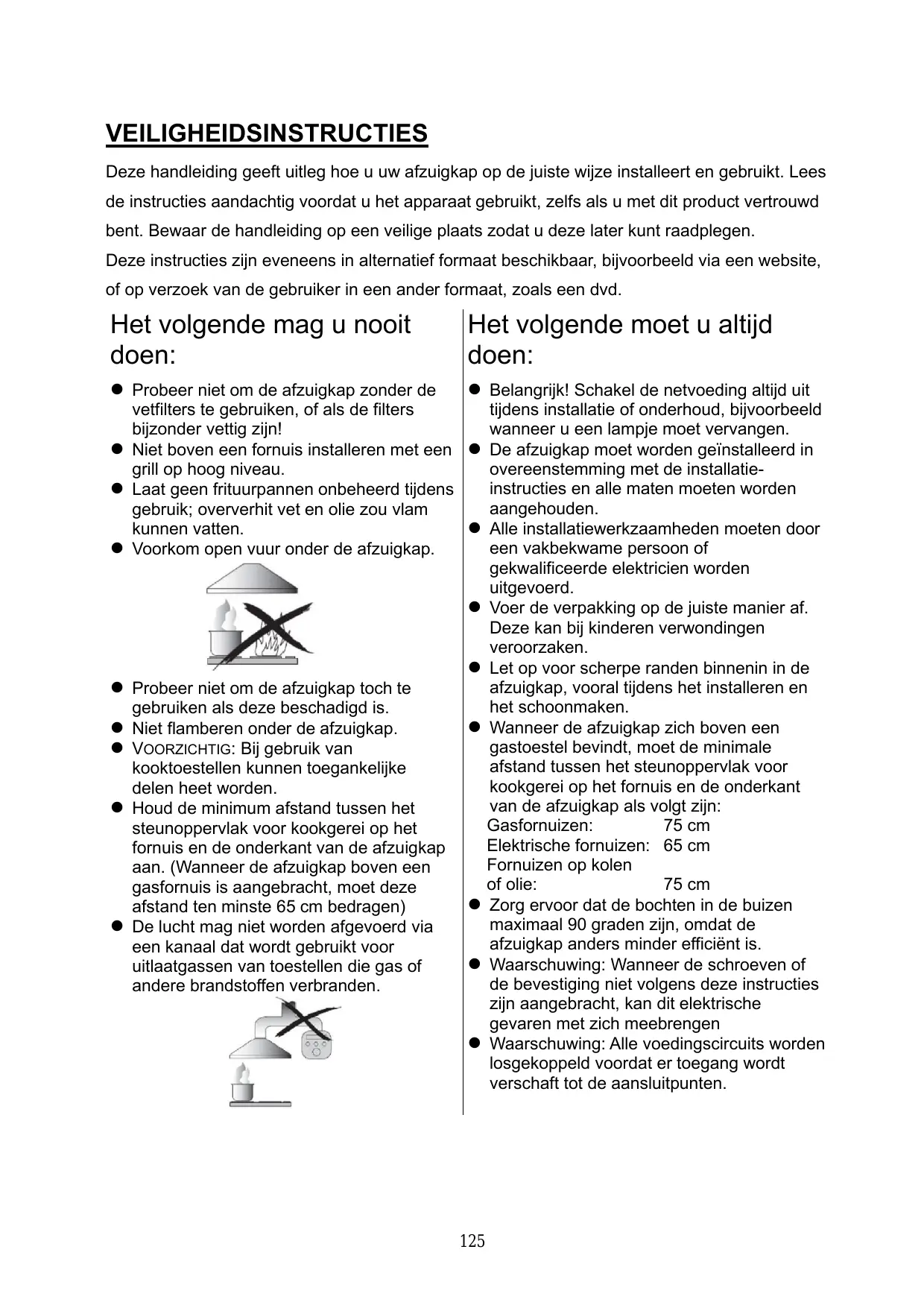 VEILIGHEIDSINSTRUCTIES Deze handleiding geeft uitleg hoe u uw afzuigkap op de juiste wijze installeert en gebruikt. Lees de instructies aandachtig voordat u het apparaat gebruikt, zelfs als u met dit product vertrouwd bent. Bewaar de handleiding op een veilige plaats zodat u deze later kunt raadplegen. Deze instructies zijn eveneens in alternatief formaat beschikbaar, bijvoorbeeld via een website, of op verzoek van de gebruiker in een ander formaat, zoals een dvd. Het volgende mag u nooit doen: Het volgende moet u altijd doen: ⚫ Probeer niet om de afzuigkap zonder de ⚫ Belangrijk! Schakel de netvoeding altijd uit vetfilters te gebruiken, of als de filters tijdens installatie of onderhoud, bijvoorbeeld bijzonder vettig zijn! wanneer u een lampje moet vervangen. ⚫ Niet boven een fornuis installeren met een ⚫ De afzuigkap moet worden geïnstalleerd in grill op hoog niveau. overeenstemming met de installatieinstructies en alle maten moeten worden ⚫ Laat geen frituurpannen onbeheerd tijdens aangehouden. gebruik; oververhit vet en olie zou vlam kunnen vatten. ⚫ Alle installatiewerkzaamheden moeten door een vakbekwame persoon of ⚫ Voorkom open vuur onder de afzuigkap. gekwalificeerde elektricien worden uitgevoerd. ⚫ Voer de verpakking op de juiste manier af. Deze kan bij kinderen verwondingen veroorzaken. ⚫ Let op voor scherpe randen binnenin in de afzuigkap, vooral tijdens het installeren en ⚫ Probeer niet om de afzuigkap toch te het schoonmaken. gebruiken als deze beschadigd is. ⚫ Wanneer de afzuigkap zich boven een ⚫ Niet flamberen onder de afzuigkap. gastoestel bevindt, moet de minimale ⚫ VOORZICHTIG: Bij gebruik van afstand tussen het steunoppervlak voor kooktoestellen kunnen toegankelijke kookgerei op het fornuis en de onderkant delen heet worden. van de afzuigkap als volgt zijn: ⚫ Houd de minimum afstand tussen het Gasfornuizen: 75 cm steunoppervlak voor kookgerei op het Elektrische fornuizen: 65 cm fornuis en de onderkant van de afzuigkap Fornuizen op kolen aan. (Wanneer de afzuigkap boven een of olie: 75 cm gasfornuis is aangebracht, moet deze ⚫ Zorg ervoor dat de bochten in de buizen afstand ten minste 65 cm bedragen) maximaal 90 graden zijn, omdat de ⚫ De lucht mag niet worden afgevoerd via afzuigkap anders minder efficiënt is. een kanaal dat wordt gebruikt voor ⚫ Waarschuwing: Wanneer de schroeven of uitlaatgassen van toestellen die gas of de bevestiging niet volgens deze instructies andere brandstoffen verbranden. zijn aangebracht, kan dit elektrische gevaren met zich meebrengen ⚫ Waarschuwing: Alle voedingscircuits worden losgekoppeld voordat er toegang wordt verschaft tot de aansluitpunten.