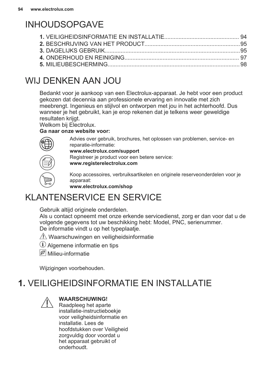 INHOUDSOPGAVE 1. VEILIGHEIDSINFORMATIE EN INSTALLATIE 94 2. BESCHRIJVING VAN HET PRODUCT95 3. DAGELIJKS GEBRUIK95 4. ONDERHOUD EN REINIGING 97 5. MILIEUBESCHERMING 98