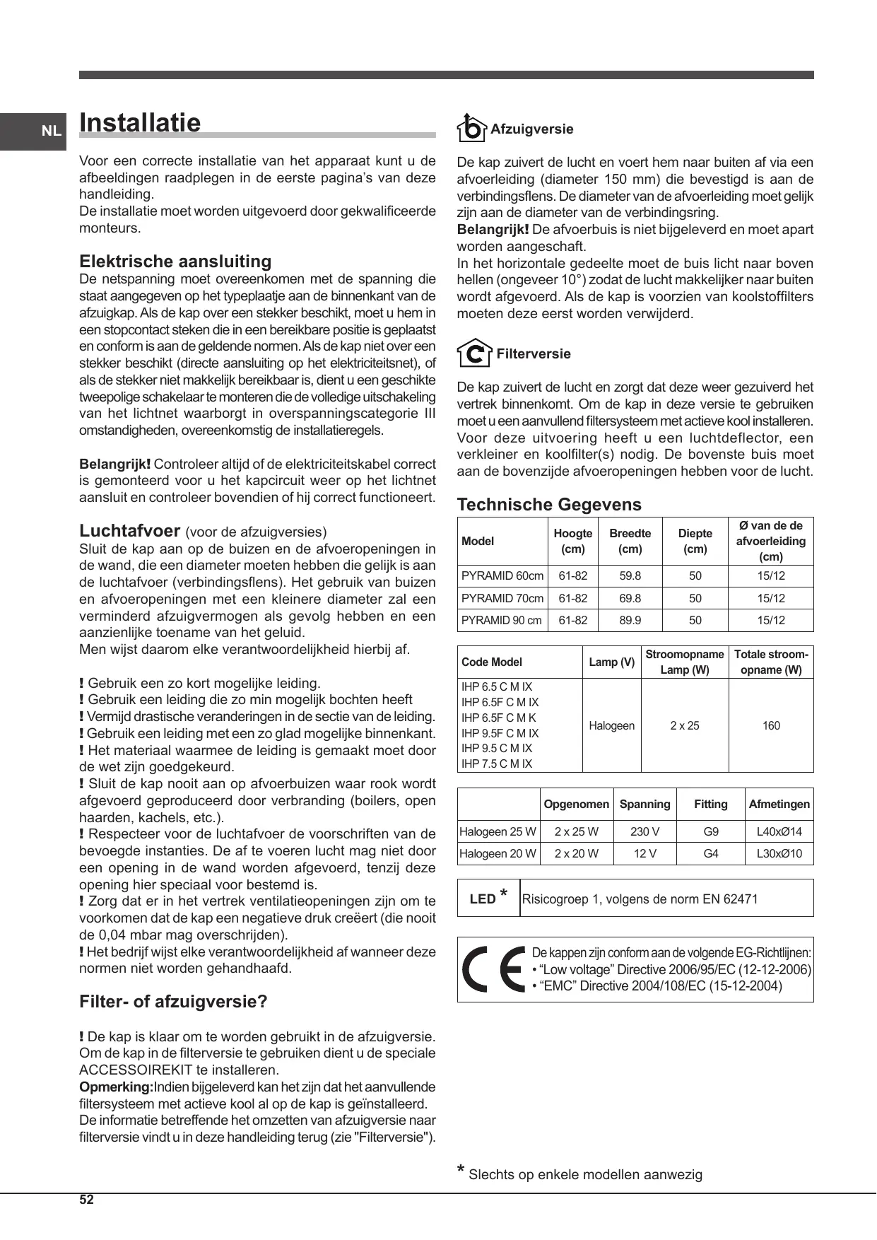 Attentie ! Het is belangrijk dat u deze handleiding bewaart zodat u hem te allen tijde kunt raadplegen. Wanneer u het apparaat verkoopt, weggeeft of wanneer u verhuist, moet u niet vergeten de handleiding bij het apparaat te doen. ! Lees de aanwijzingen aandachtig: er staat belangrijke informatie in betreffende installatie, gebruik en veiligheid. ! Voer geen elektrische of mechanische wijzigingen op het apparaat uit, of op de afvoerleidingen.