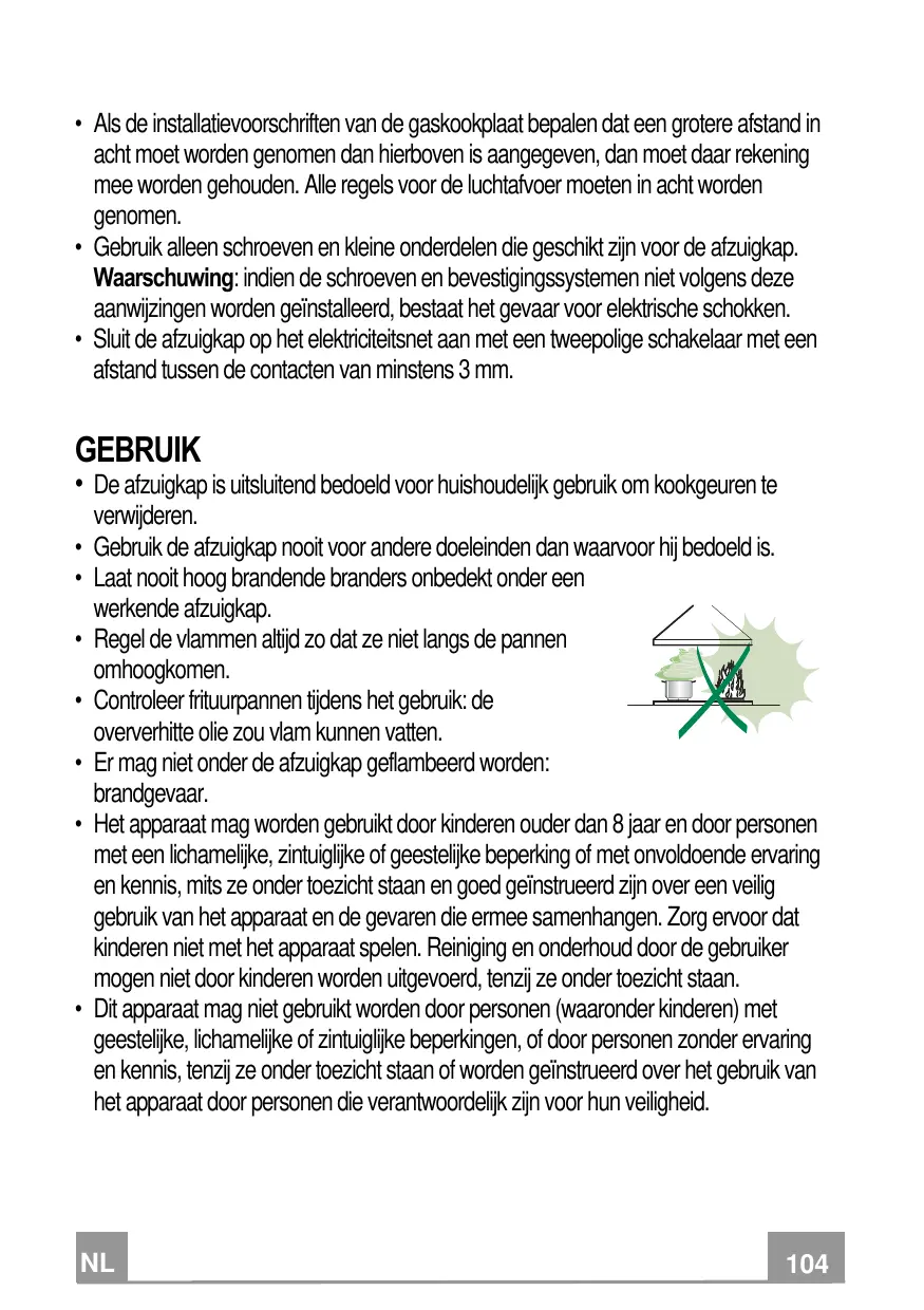 • Cette hotte aspirante a été conçue exclusivement pour un usage domestique, dans le but d’éliminer les odeurs de cuisine. • Ne jamais utiliser la hotte pour des objectifs différents de ceux pour lesquels elle a été conçue. • Ne jamais laisser un feu vif allumé sous la hotte lorsque celle-ci est en fonction. • Régler l’intensité du feu de manière à l’orienter exclusivement vers le fond de la casserole, en vous assurant qu’il ne déborde pas sur les côtés. • Contrôler constamment les friteuses durant leur utilisation : l’huile surchauffée risque de s’incendier. • Ne pas flamber des mets sous la hotte : sous risque de provoquer un incendie. • Cet appareil n’est pas destiné à être utilisé par des enfants d’un âge inférieur à 8 ans, ni par des personnes dont les capacités physiques, sensorielles ou mentales sont diminuées ou qui ont une expérience et des connaissances insuffisantes, à moins que ces enfants ou ces personnes ne soient attentivement surveillés et instruits sur la manière d’utiliser cet appareil en sécurité et sur les dangers que cela comporte. Assurez-vous que les enfants ne jouent pas avec cet appareil. Le nettoyage et l’entretien de la part de l’utilisateur ne doivent pas être effectués par des enfants, à moins que ce ne soit sous la surveillance d’une personne responsable. • Cet appareil n’est pas destiné à être utilisé par des personnes (enfants compris) dont les capacités physiques, sensorielles ou mentales sont diminuées ou ayant une expérience et des connaissances insuffisantes, à moins que ces personnes ne soient attentivement surveillées et instruites par un responsable de leur sécurité.