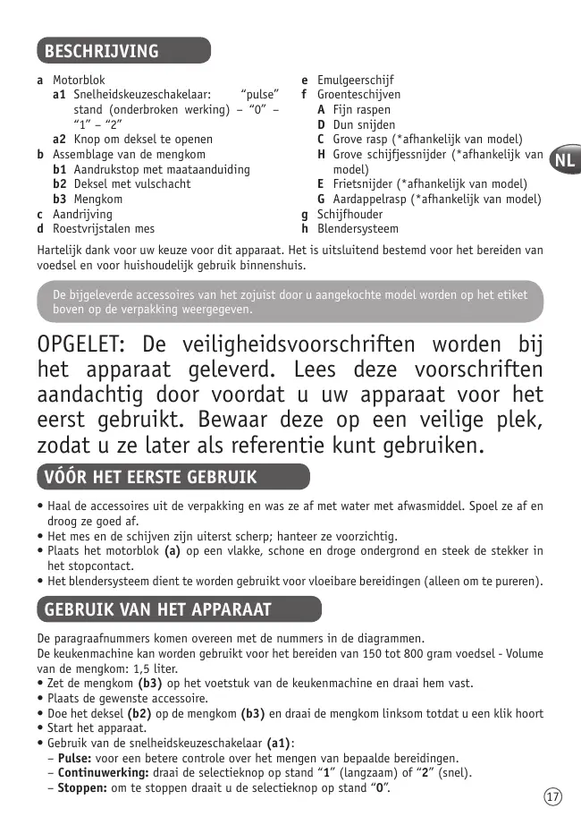 AVERTISSEMENT : Les consignes de sécurité font partie de l’appareil. Veuillez les lire attentivement avant d’utiliser votre nouvel appareil. Gardez-les dans un endroit où vous pourrez les retrouver et vous y référer ultérieurement. AVANT LA PREMIÈRE UTILISATION • Sortez les accessoires de leur emballage et nettoyez-les à l’eau savonneuse. Rincez puis séchez soigneusement. • Les couteaux et disques sont extrêmement aiguisés, manipulez-les avec précaution. • Placez le bloc moteur (a) sur une surface plane, propre et sèche puis branchez votre appareil. • Le blender system est à utiliser avec des préparations liquides (uniquement pour la fonction Mixer).