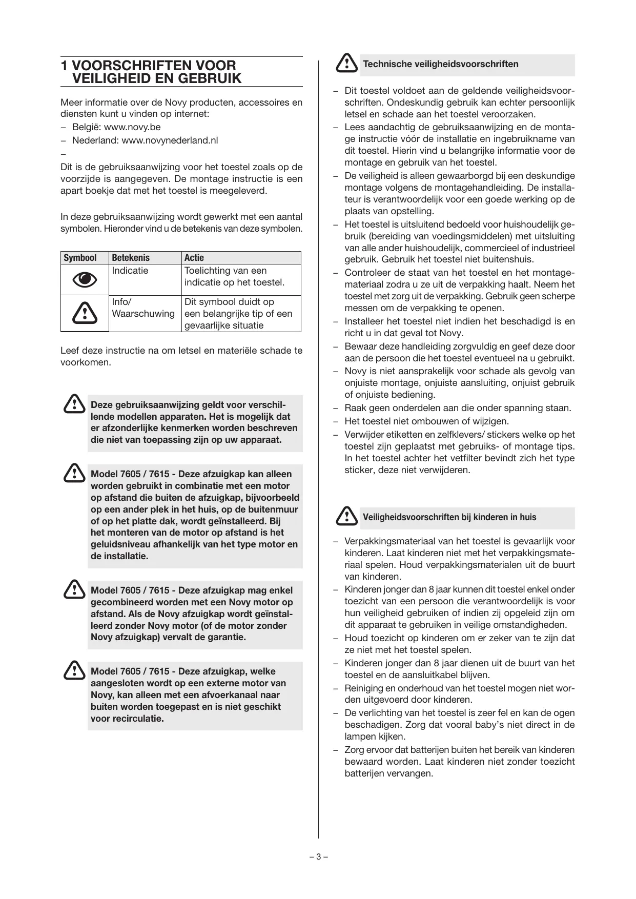− Dit toestel voldoet aan de geldende veiligheidsvoorschriften. Ondeskundig gebruik kan echter persoonlijk letsel en schade aan het toestel veroorzaken. − Lees aandachtig de gebruiksaanwijzing en de montage instructie vóór de installatie en ingebruikname van dit toestel. Hierin vind u belangrijke informatie voor de montage en gebruik van het toestel. − De veiligheid is alleen gewaarborgd bij een deskundige montage volgens de montagehandleiding. De installateur is verantwoordelijk voor een goede werking op de plaats van opstelling. − Het toestel is uitsluitend bedoeld voor huishoudelijk gebruik (bereiding van voedingsmiddelen) met uitsluiting van alle ander huishoudelijk, commercieel of industrieel gebruik. Gebruik het toestel niet buitenshuis. − Controleer de staat van het toestel en het montagemateriaal zodra u ze uit de verpakking haalt. Neem het toestel met zorg uit de verpakking. Gebruik geen scherpe messen om de verpakking te openen. − Installeer het toestel niet indien het beschadigd is en richt u in dat geval tot Novy. − Bewaar deze handleiding zorgvuldig en geef deze door aan de persoon die het toestel eventueel na u gebruikt. − Novy is niet aansprakelijk voor schade als gevolg van onjuiste montage, onjuiste aansluiting, onjuist gebruik of onjuiste bediening. − Raak geen onderdelen aan die onder spanning staan. − Het toestel niet ombouwen of wijzigen. − Verwijder etiketten en zelfklevers/ stickers welke op het toestel zijn geplaatst met gebruiks- of montage tips. In het toestel achter het vetfilter bevindt zich het type sticker, deze niet verwijderen. Meer informatie over de Novy producten, accessoires en diensten kunt u vinden op internet: − België: www.novy.be − Nederland: www.novynederland.nl Dit is de gebruiksaanwijzing voor het toestel zoals op de voorzijde is aangegeven. De montage instructie is een apart boekje dat met het toestel is meegeleverd. In deze gebruiksaanwijzing wordt gewerkt met een aantal symbolen. Hieronder vind u de betekenis van deze symbolen. Symbool