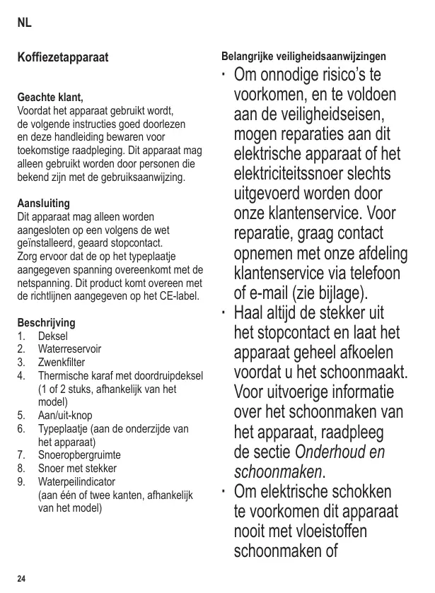 NL Koffiezetapparaat Geachte klant, Voordat het apparaat gebruikt wordt, de volgende instructies goed doorlezen en deze handleiding bewaren voor toekomstige raadpleging. Dit apparaat mag alleen gebruikt worden door personen die bekend zijn met de gebruiksaanwijzing. Aansluiting Dit apparaat mag alleen worden aangesloten op een volgens de wet geïnstalleerd, geaard stopcontact. Zorg ervoor dat de op het typeplaatje aangegeven spanning overeenkomt met de netspanning. Dit product komt overeen met de richtlijnen aangegeven op het CE-label. Beschrijving 1. Deksel 2. Waterreservoir 3. Zwenkfilter 4. Thermische karaf met doordruipdeksel (1 of 2 stuks, afhankelijk van het model) 5. Aan/uit-knop 6. Typeplaatje (aan de onderzijde van het apparaat) 7. Snoeropbergruimte 8. Snoer met stekker 9. Waterpeilindicator (aan één of twee kanten, afhankelijk van het model)