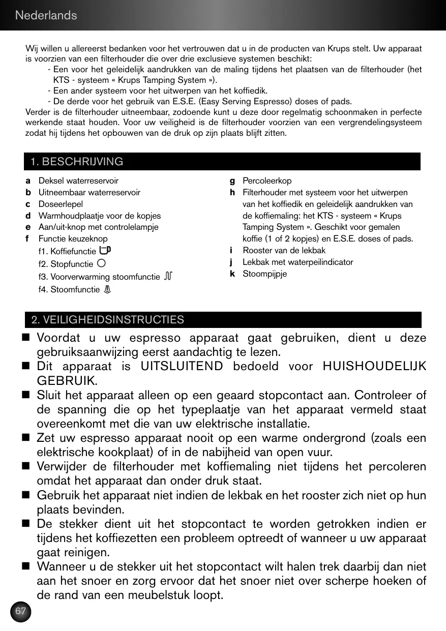 - L’un pour le tassage progressif de la mouture lors du positionnement du porte-filtre (système KTS « Krups Tamping System »). - L’autre pour l’éjection du marc. - Le dernier pour l’utilisation de dosettes E.S.E. (Easy Serving Espresso) ou souples. Il est en outre démontable, ce qui permet de le maintenir, par des nettoyages fréquents, en parfait état de fonctionnement. Par sécurité, votre porte-filtre est équipé d’un système de verrouillage pour qu’il reste en place lors de la montée en pression.