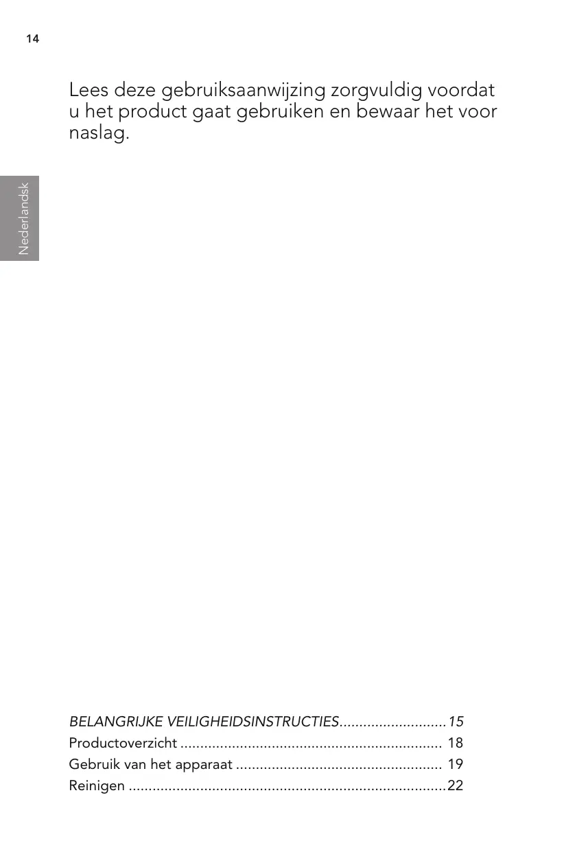 - Nederlandsk Lees deze gebruiksaanwijzing zorgvuldig voordat u het product gaat gebruiken en bewaar het voor naslag. BELANGRIJKE VEILIGHEIDSINSTRUCTIES p. 15
